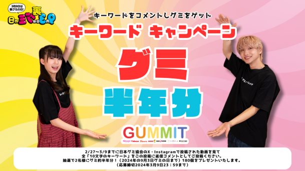 UHA味覚糖株式会社(本社:大阪市中央区、代表取締役:山田泰正)が参加するGUMMITは、9月3日のグミの日に続き、3月9日を「裏グミの日」として、キャンペーンを実施致します。