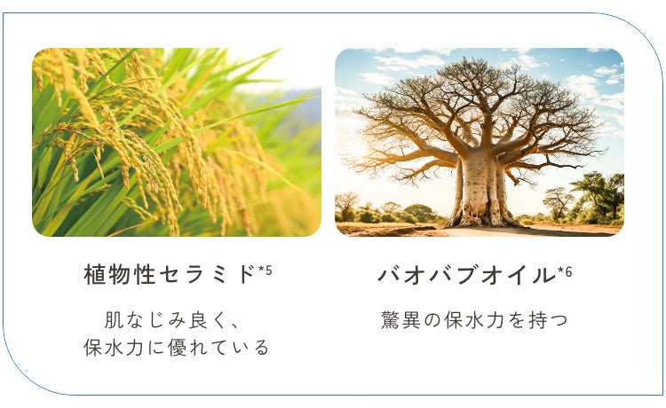 Point 1 / 植物性セラミド*⁵ & バオバブオイル*⁶ 配合でうるおい引き込み蓄える*³ 肌に!