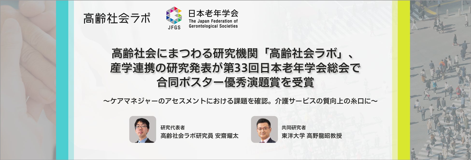 高齢社会にまつわる研究機関「高齢社会ラボ」、産学連携の研究発表が第33回日本老年学会総会で合同ポスター優秀演題賞を受賞