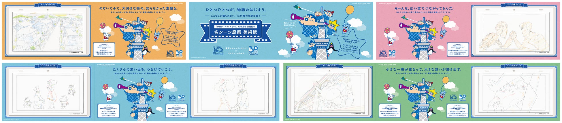 アニメ「クレヨンしんちゃん」放送開始30周年と、映画30作品目『映画クレヨンしんちゃん もののけニンジャ珍風伝』の公開を記念して、東京スカイツリータウン®内東京ソラマチ®にて、記念企画を実施します。映画作品の名シーンの原画を展示するほか、アニメ放送開始30周年記念グッズの販売、歴代映画ポスターの展示、フォトスポットパネルの設置等を行います。思い出される数々の名シーン、この機会にぜひご覧ください。