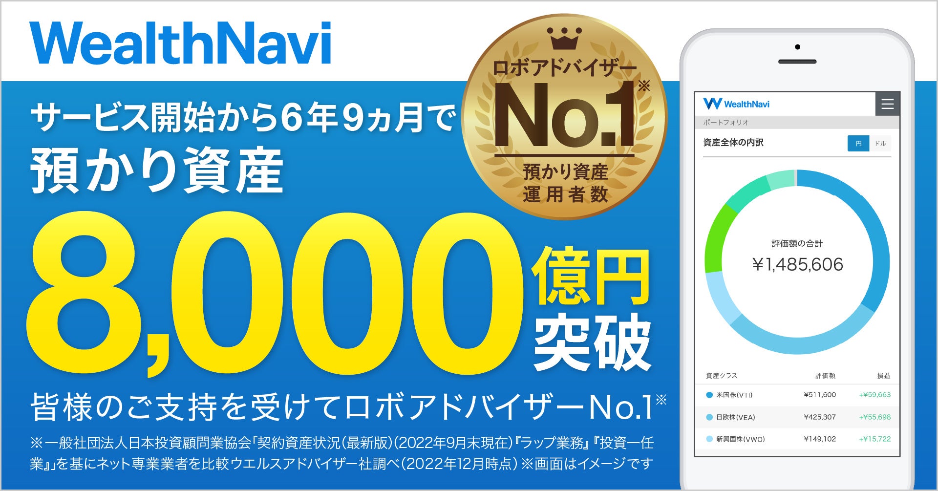 預かり資産・運用者数 国内No.1ロボアドバイザー(※1)「WealthNavi(ウェルスナビ)」を提供するウェルスナビ株式会社(本社:東京都渋谷区、代表取締役CEO:柴山和久、以下「当社」)は、2016年7月の正式リリースから約6年9カ月となる2023年4月18日時点で、預かり資産8,000億円を突破したことをお知らせします。