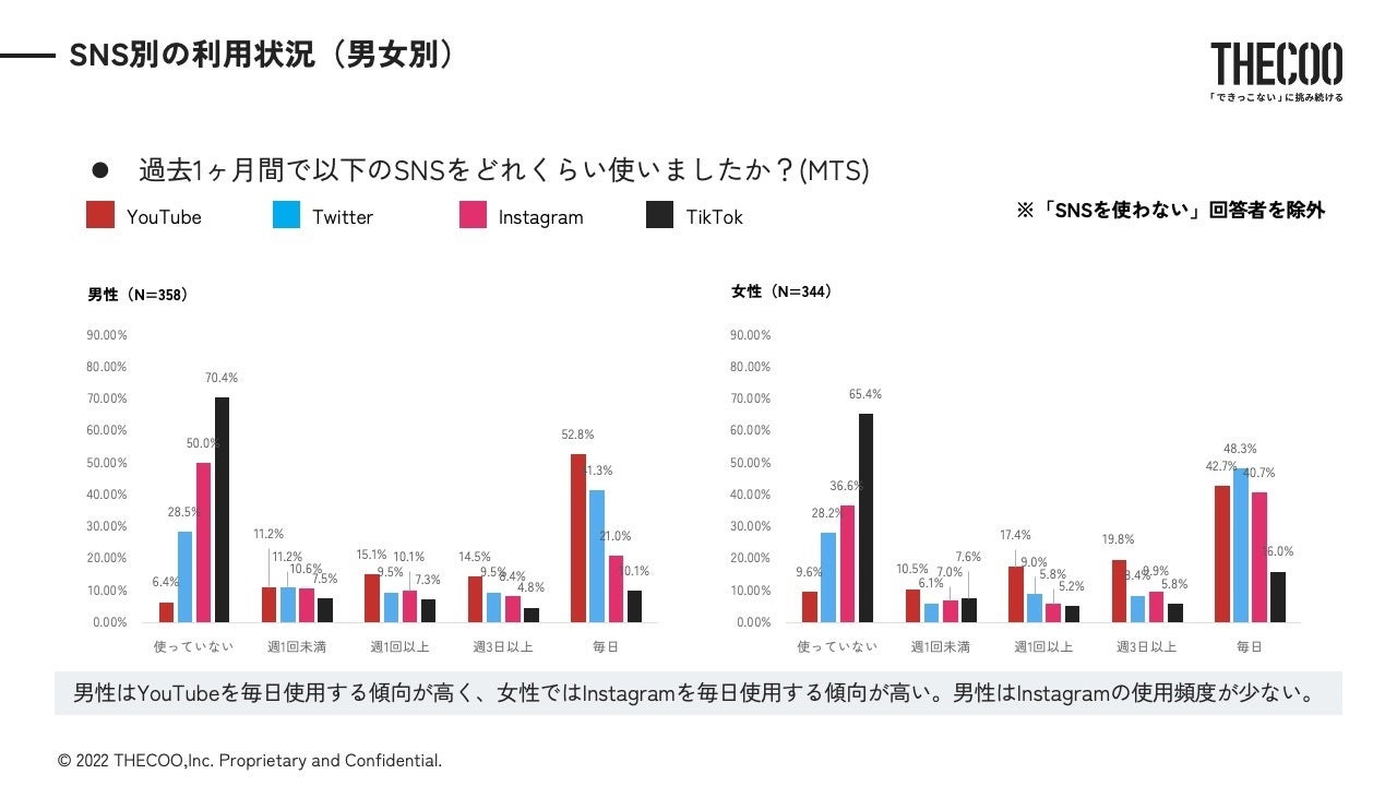 男女別にみると、男性はYouTubeを毎日使用する傾向が高く(52.8%)一方でInstagramは少ない(21.0%)、女性(40.7%)と比較した際に大きな差となりました。