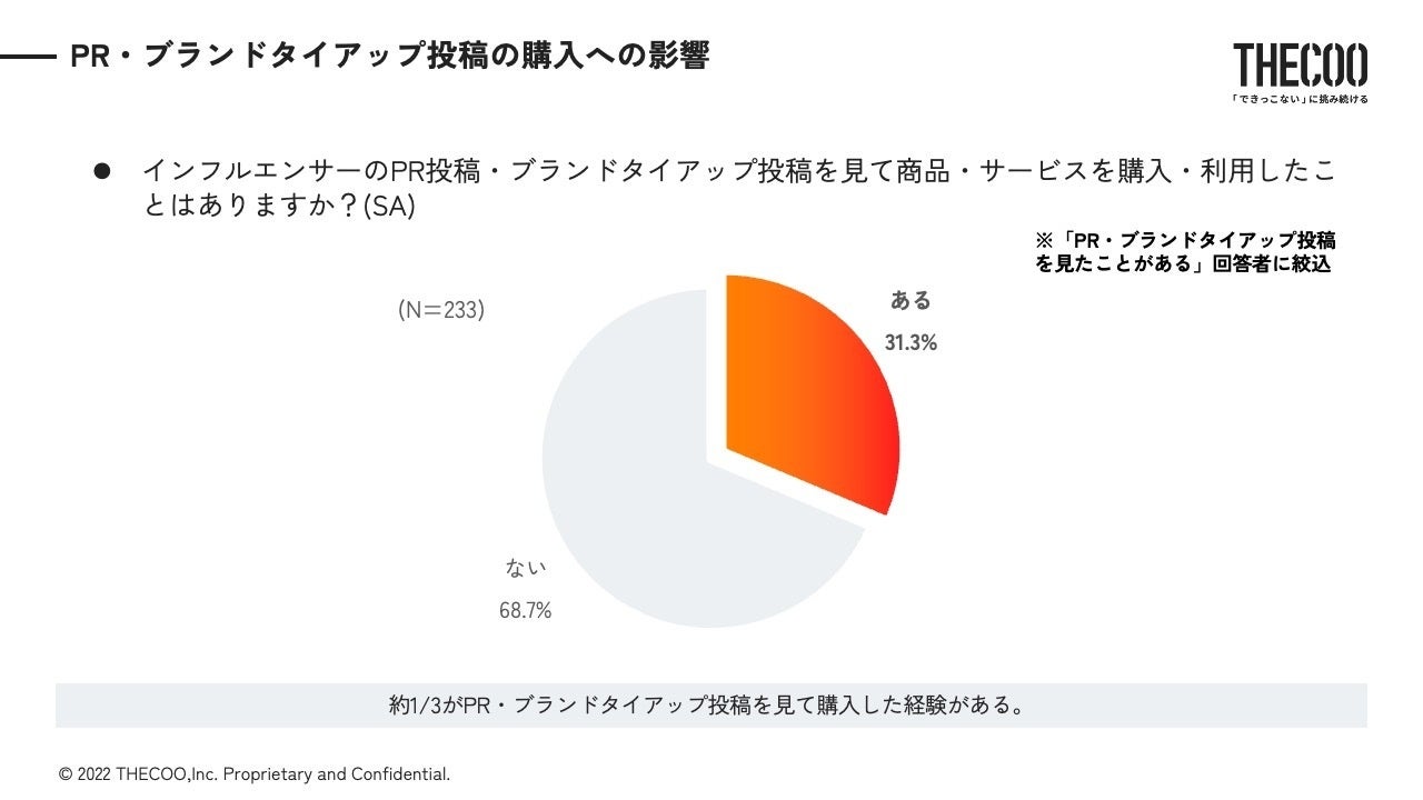 - PR、ブランドタイアップ投稿を見て商品・サービスを購入したことがある人は31.3%