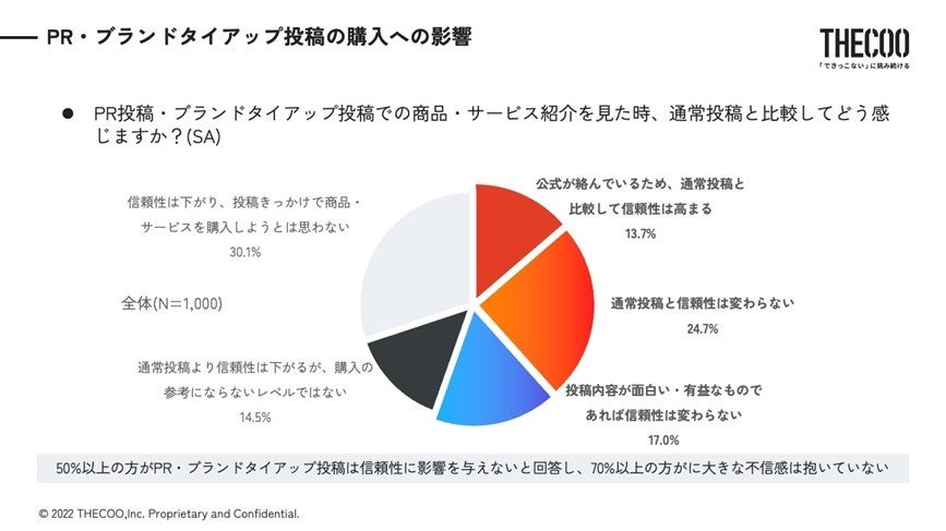「PR投稿・ブランドタイアップ投稿での商品・サービス紹介を見た時、通常投稿と比較してどう感じますか?」という質問に対し、「公式が絡んでいるため、通常投稿と比較して信頼性は高まる」は13.7%、「通常投稿と信頼性は変わらない」は24.7%、「投稿内容が面白い・有益なものであれば信頼性は変わらない」は17.0%と、信頼性が高まる、もしくは変わらないと回答した人はあわせて54.4%になりました。さらに「通常投稿より信頼性は下がるが、購入の参考にならないレベルではない」を合わせると69.9%となり、7割の回答者はPR・ブランドタイアップ投稿に対して大きな不信感を抱いていないことが明らかになりました。