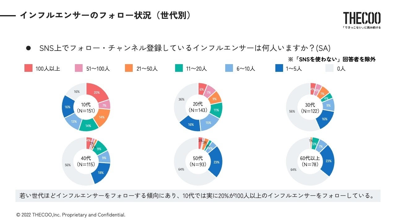 世代別にみると、若い世代ほどインフルエンサーをフォローする傾向にあり、10代では実に20%が100人以上のインフルエンサーをフォローし、半数以上(51%)が10人以上フォローしていました。