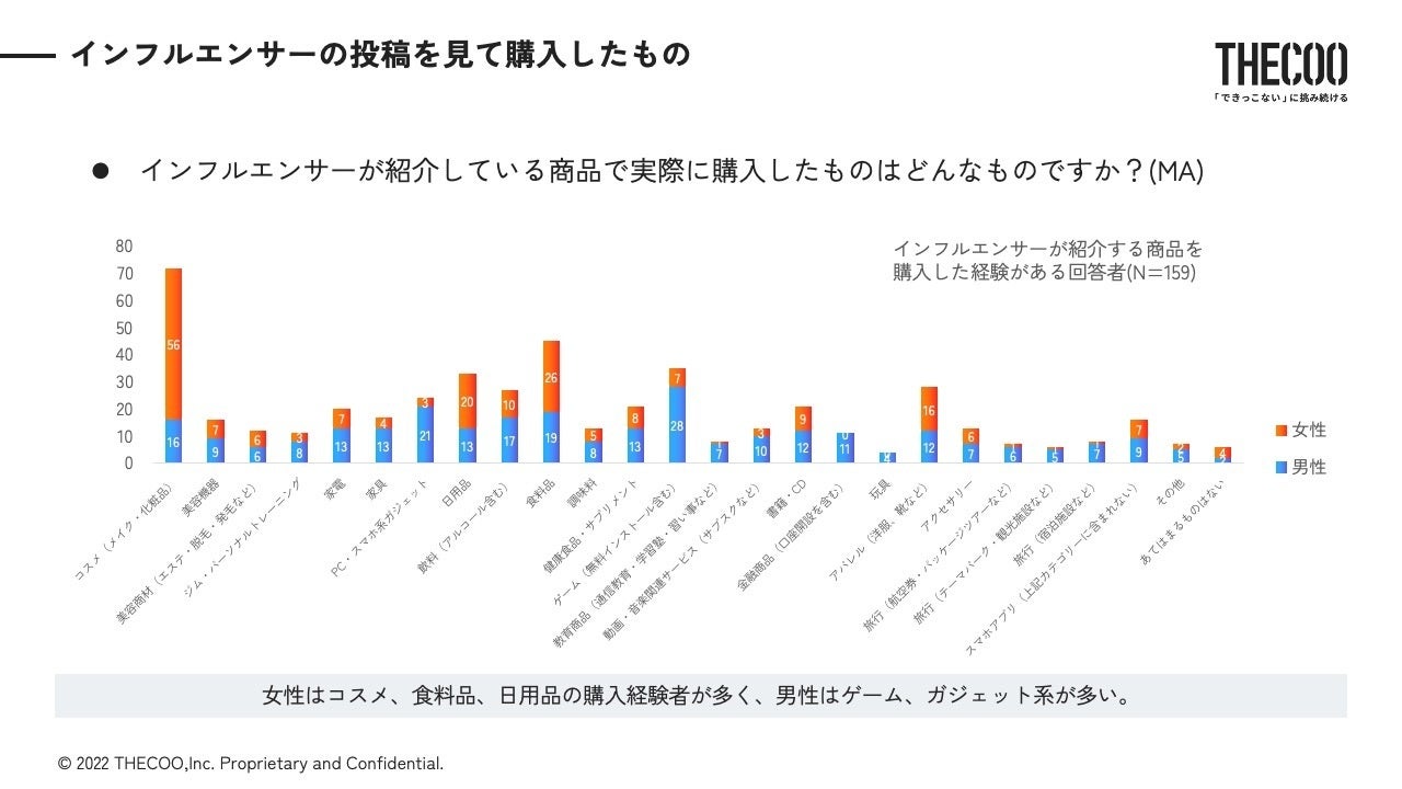 - インフルエンサーの影響から購入した商品で最も多いのは女性「コスメ」、男性「ゲーム」
