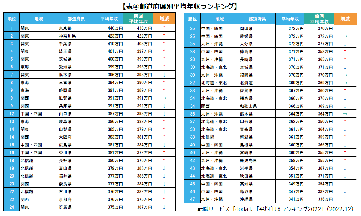 「平均年収ランキング2022」https://doda.jp/guide/heikin/「女性の平均年収ランキング2022」https://doda.jp/woman/guide/heikin/