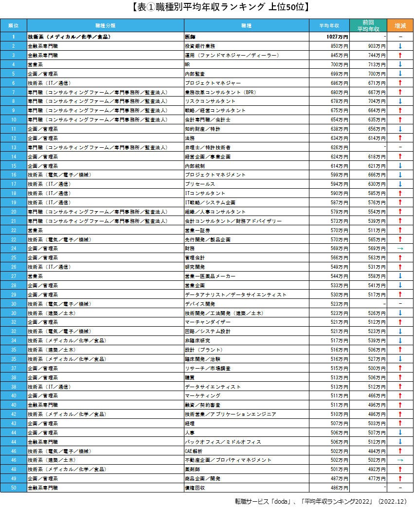 また、全167職種のうち、ランキング1位は「技術系(メディカル/化学/食品)」の「医師」(1,027万円)でした。2位と3位には「金融系専門職」の「投資銀行業務」(850万円)と「運用(ファンドマネジャー/ディーラー)」(845万円)が続きました。