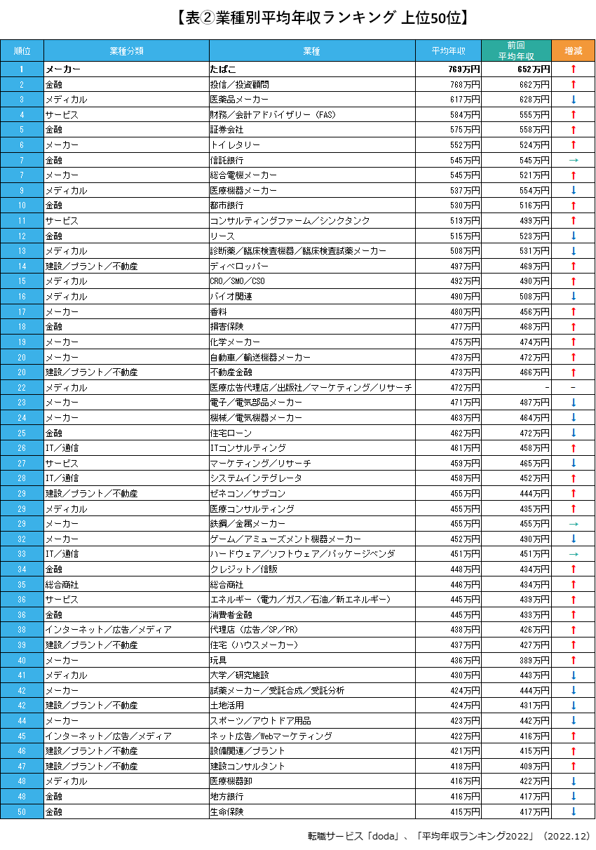 転職サービス「doda」、「平均年収ランキング2022」を発表 正社員の平均年収は前年と変わらず403万円、回復の兆しはまだ見えず
