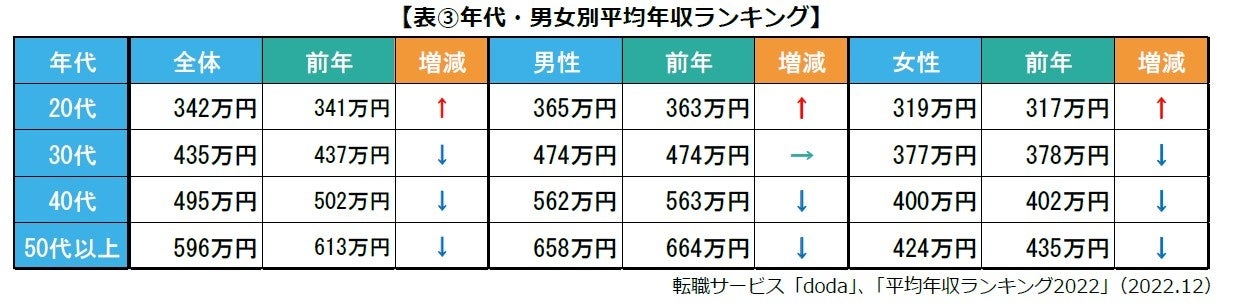 男女別※4で見てみると、前年比で20代の男性と女性はともに2万円アップしました。平均年収の減少幅が特に大きいのは50代以上で、男性で6万円、女性で11万円ダウンしています。