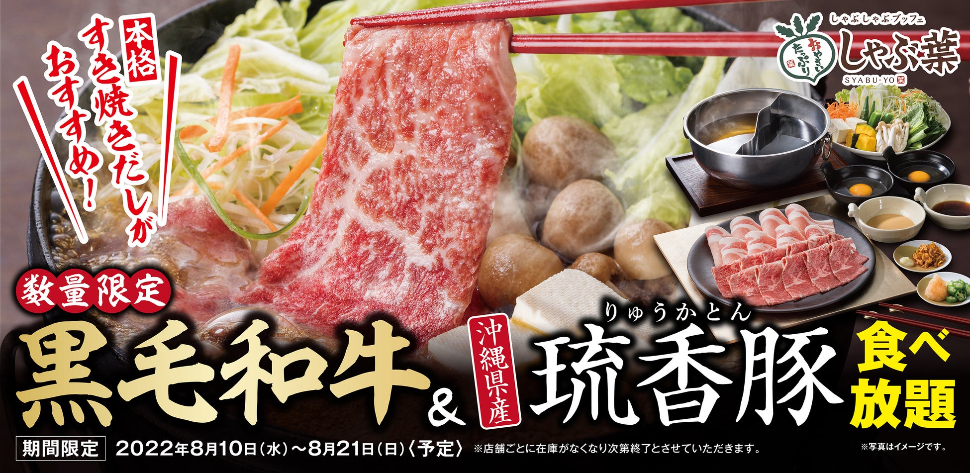 株式会社すかいらーくレストランツ(本社・東京都武蔵野市、代表取締役社長 大川原利明)が運営する「しゃぶ葉」では、2022年8月10日(水)より、「黒毛和牛&沖縄県産 琉香豚(りゅうかとん)食べ放題」をご提供いたします。