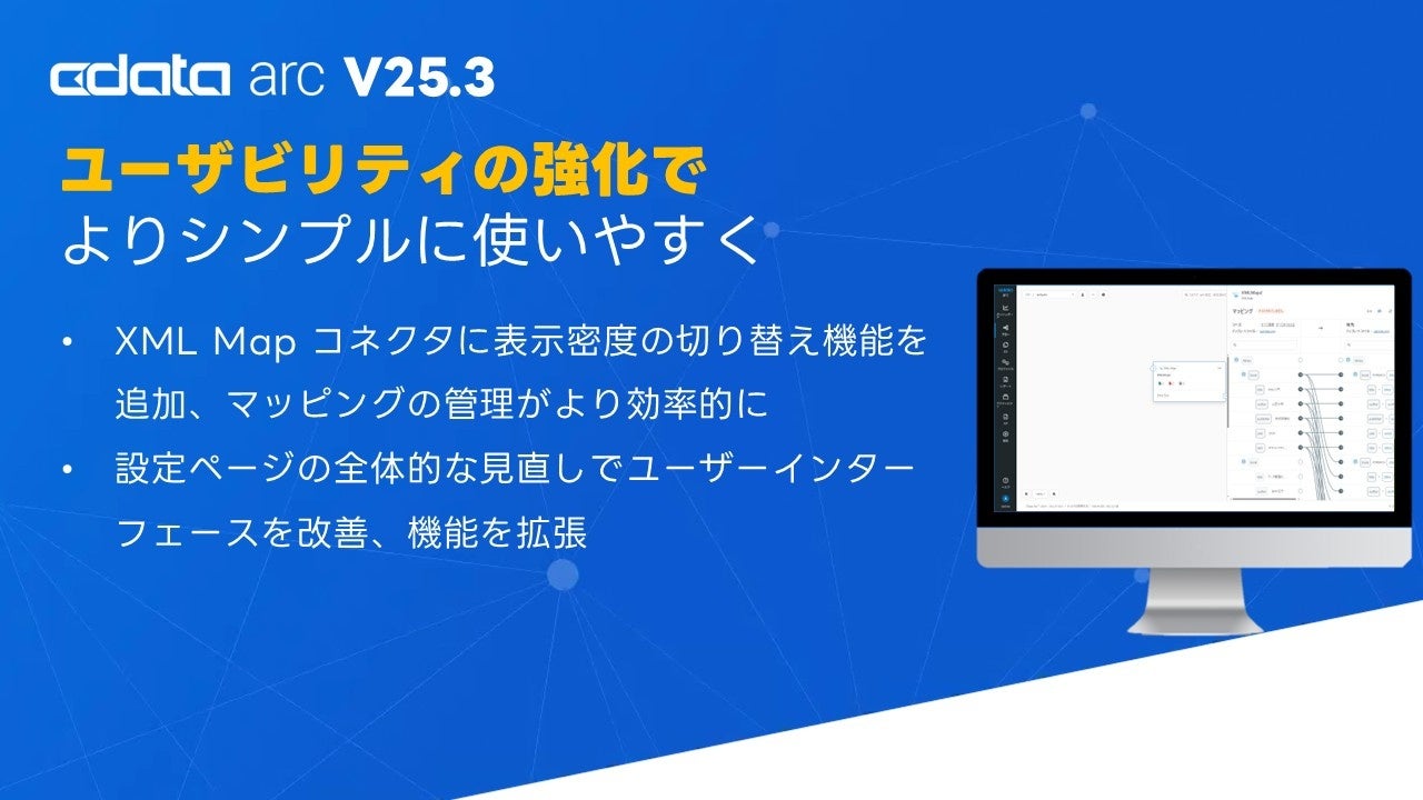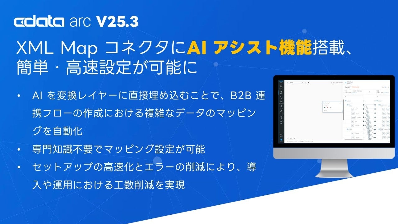 2025年10月8日、CData Software Japan 合同会社(本社:アメリカノースカロライナ州、日本オフィス:宮城県仙台市、代表社員 職務執行者:疋田 圭介、以下CData)は、B2B データ連携ツール『CData Arc V25.3』をリリースしました。本アップデートでは、XML Map コネクタにマッピングを自動生成するためのAI アシスト機能を追加。専門知識不要でマッピング設定を行えるようになり、設定にかかる時間の大幅削減が可能になりました。また、ICAP コネクタの搭載によりリアルタイムのコンテンツスキャンとフィルタリングを実現するとともに、SSO などの機能においてエンタープライズグレードのセキュリティ強化にも対応。ユーザビリティの強化として、XML Map コネクタの表示画面の改善や設定ページの全体的な見直しも行い、よりシンプルで安全な機能を提供します。