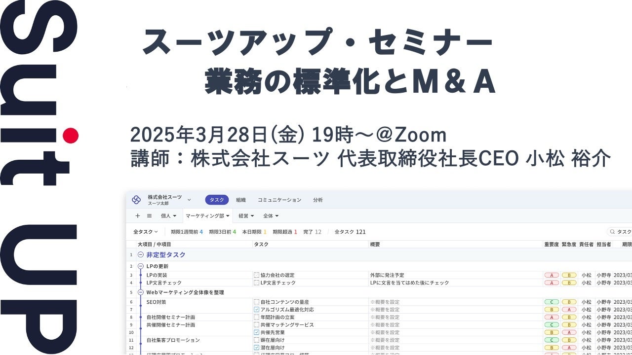 株式会社スーツ(所在地:東京都千代田区、代表取締役社長CEO:小松 裕介)は、2025年3月28日(金)19時から、当社代表の小松が講師を務めるスーツアップ・セミナー「業務の標準化とM&A」を無料開催します。