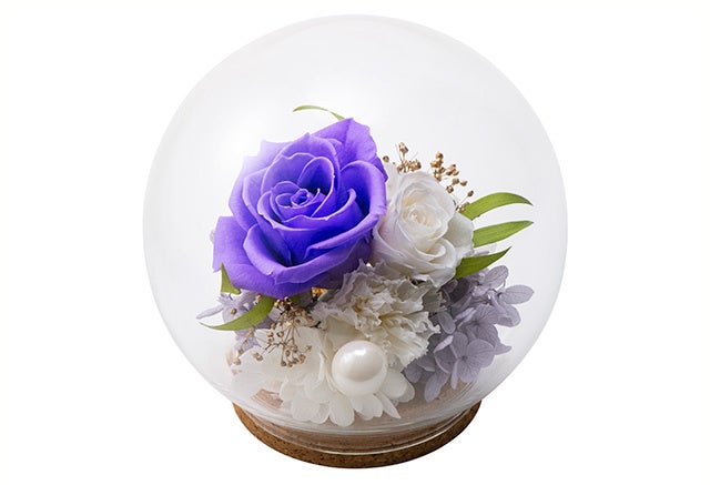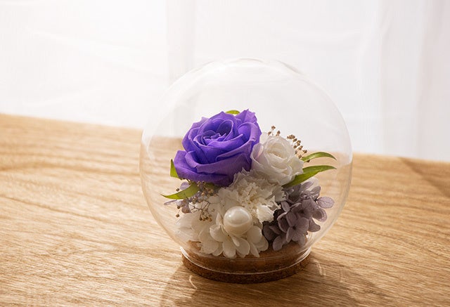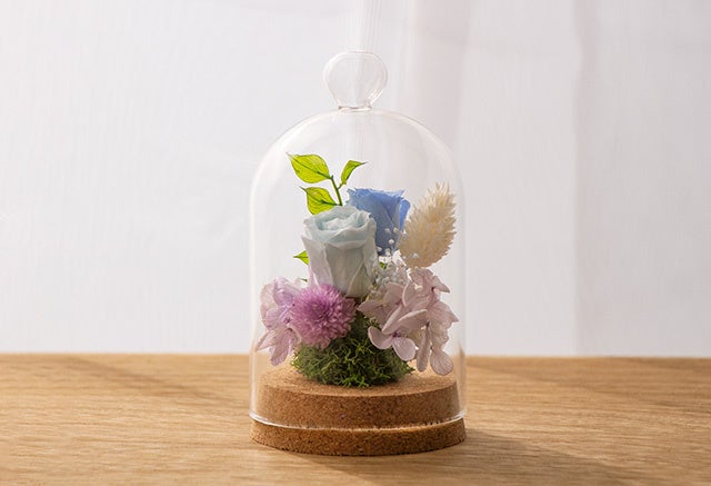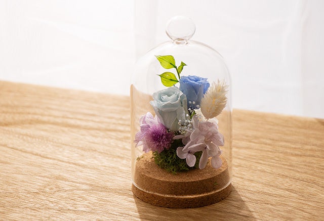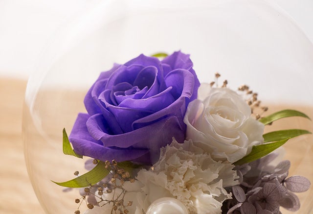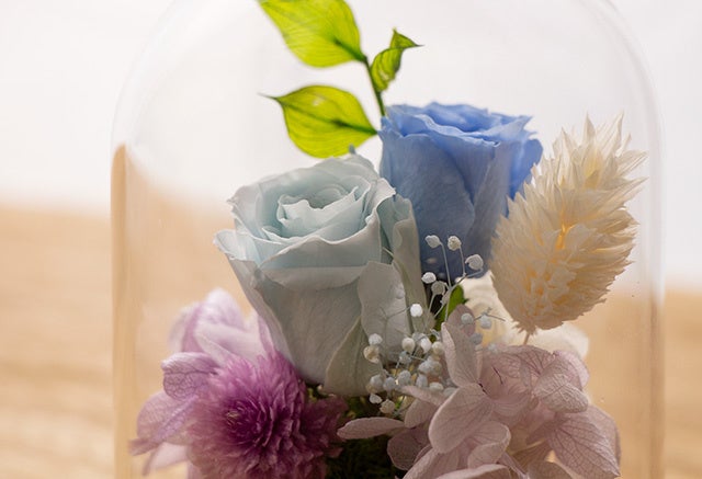淡いブルーやパープルのバラを主役にした、上品で優しい色合いのプリザーブドフラワーは、故人やご遺族に寄り添う気持ちをお届けします。透明度の高いガラスケースだから、花にホコリをかぶらず色合いもクリア。360°どの角度から見ても美しく、インテリアとして飾っていただけます。