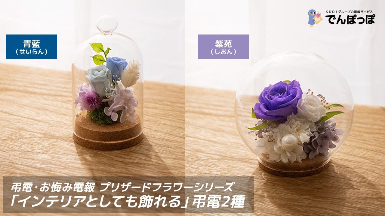でんぽっぽ、リビングや玄関にも「インテリアとしても飾れる」弔電2種発売 ~360°どこから見ても美しい、プリザーブドフラワーのガラスケースアレンジ