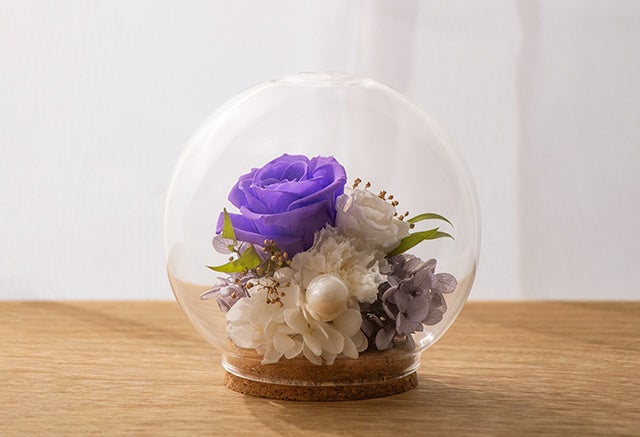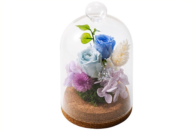 生花から水分を抜く特殊技法で作られた「プリザーブドフラワー」シリーズは、水やりなどの手間いらずで、生花の質感と色合いを長く楽しむことができるギフト電報です※2。ガラスケースがホコリ・水分・直射日光による劣化を避けるため、より長く美しい状態を保ちます※3 。落ち着いた色合いとコンパクトなサイズにもこだわり、お部屋のどこに置いても馴染むデザインです。