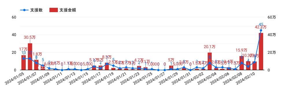 ▼支援募集期間を通じた支援数(折れ線)、及び支援金額(棒線)
