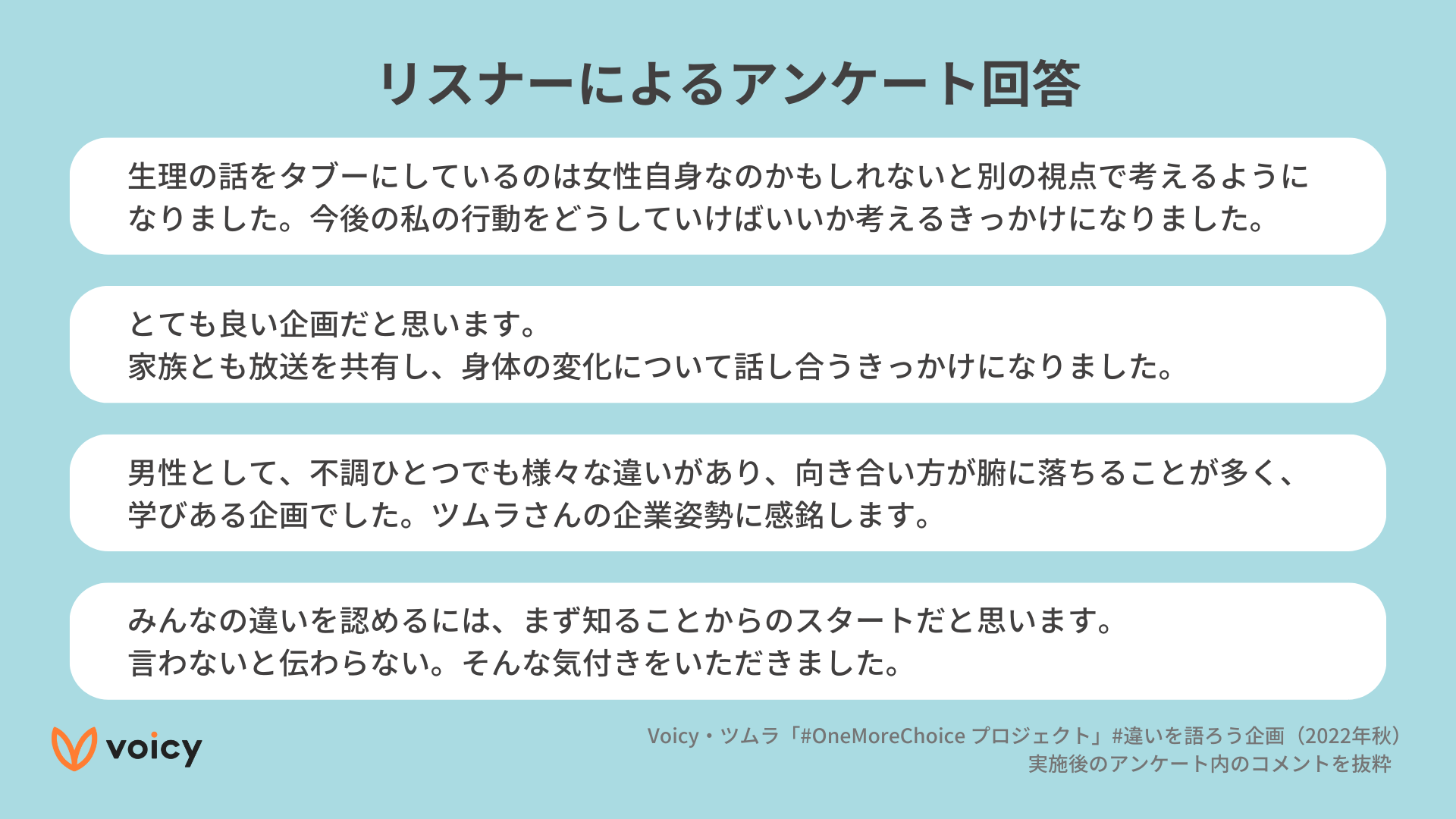 Voicyとのコラボでは、テーマの中で生理・PMSを含めた不調症状を扱っていますが、女性はもちろん、パートナーの立場、親の立場からなどさまざまな年齢・性別の方々から、「気づきが多く、考えさせられた」「素敵な考え方」「この取り組みを進める企業姿勢に共感する」といった感想をいただいたことは、とても嬉しく思います。何より、Voicyとのコラボでの最大の特長は、リスナーの方々が、プロジェクトに共感してくださっただけでなく、テーマに対してご自身の立場で考えられたうえで、実際に行動された方が非常に多かったことです。「#違いを語ろう」では、違いを知ることから、対話することの大切さを伝えていました。放送がきっかけとなり家族と話し合った方、放送を職場の同僚や周囲とシェアし実際に話し合う機会を持った方、まずは自分自身から変わっていくとお話しされた方の声を聴き、Voicyのパーソナリティ、リスナーの方々の力を実感しました。
