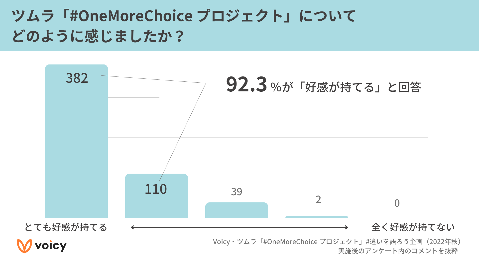 「放送を聴いてみて、気持ちの変化はありましたか?」という質問に対し、81.4%の方が「気持ちの変化があった」と回答しました。「気持ちの変化があった」と回答した方の多くは、「さまざまな“違い”を知ることが大切だと思った」と気持ちの変化について答えています。また、今回コラボレーションをしたツムラが取り組む#OneMoreChoice プロジェクトに対し、92.3%が「好感が持てる」と回答しました。