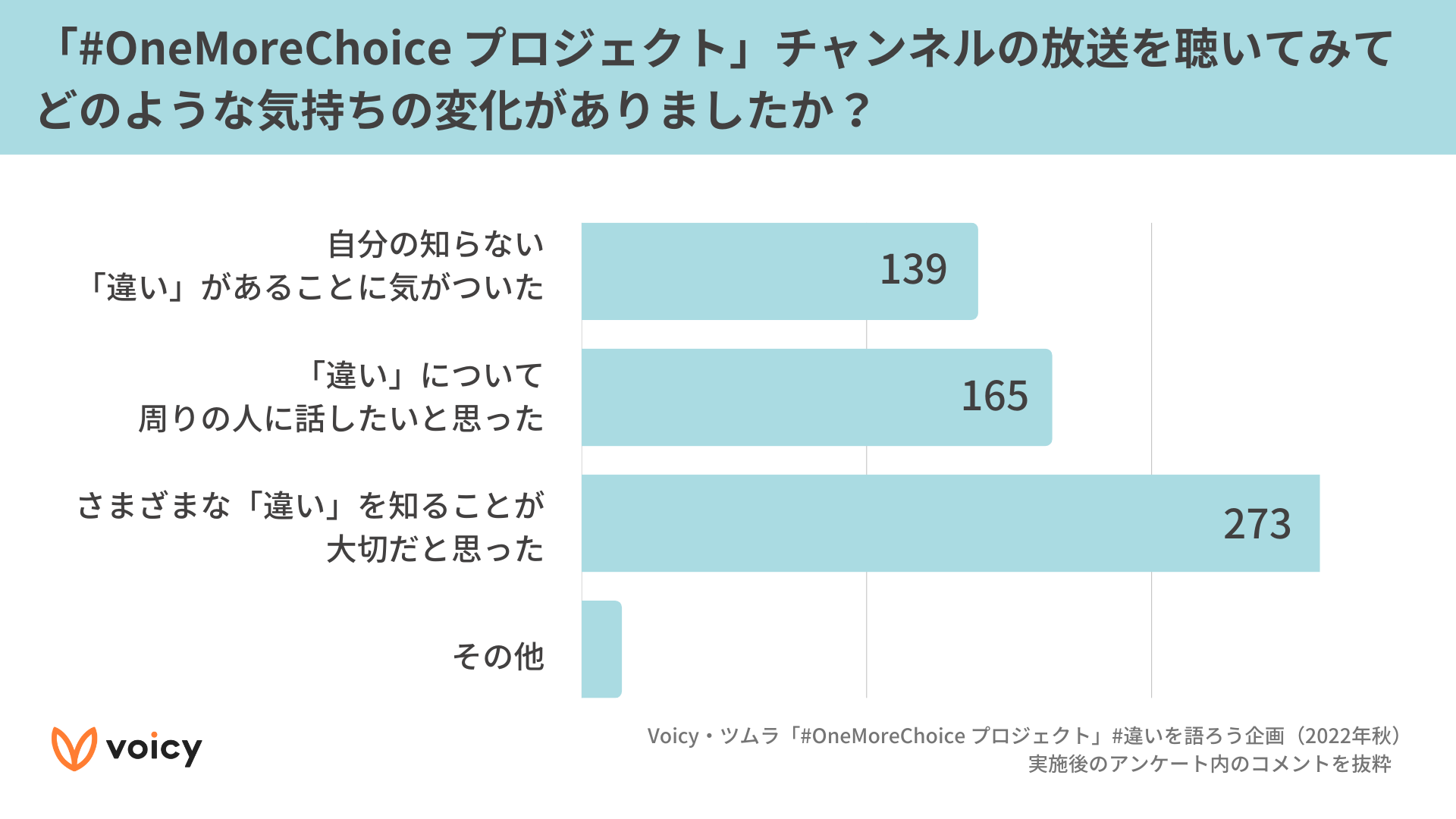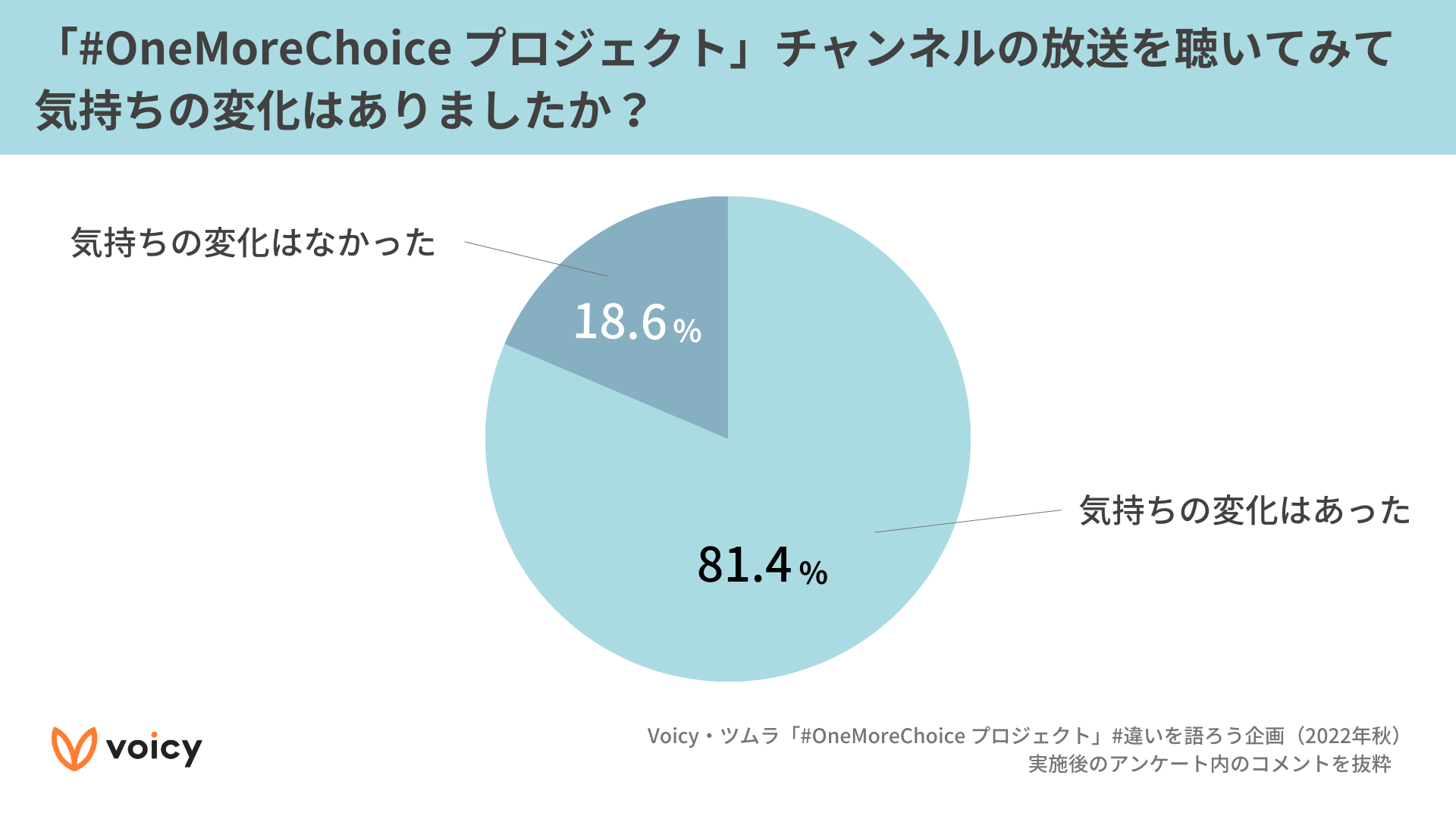 株式会社Voicyは、開発・運営する音声プラットフォームVoicyにて2022年秋に実施した、株式会社ツムラが取り組む#OneMoreChoice プロジェクトとのタイアップ企画を対象に、放送を聴いたリスナーに向けてアンケート調査を行いました。その結果、8割以上の方がテーマであった女性特有の不調を中心にした“違い”に対する気持ちが変化したことがわかりました。Voicyは声の可能性を最大化し、企業活動への共感の和を広げるべく、さらなるサポートを行っていきます。