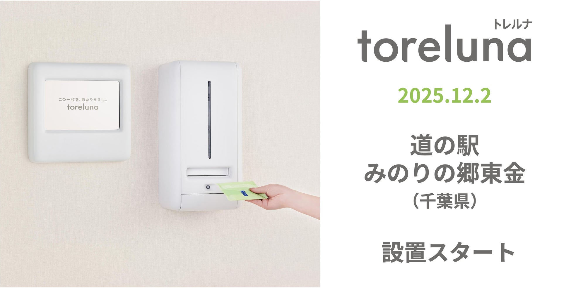 株式会社ネクイノ(大阪市北区、代表:石井 健一)は、トイレの個室で生理用ナプキンを常備し無料で提供するサービス「toreluna(トレルナ)」(以下 トレルナ)を、道の駅 みのりの郷東金へ設置し、サービスの提供を開始いたしました。