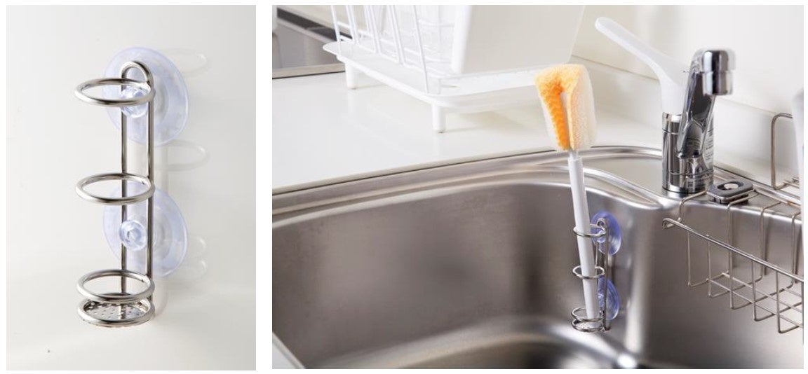 濡れた ボトル 用の洗浄 ブラシ について、保管方法に 困っている という声を 多く いただいています。一般的にはボトル洗いブラシは、ブラシ単体で販売されているものが大半で、収納ケースが付属されていません。また、使用中の「菜箸」、「お玉」についても、シンクやキッチン天板に使用面は直に触れずに空中に浮かせ、一時置きしたいという声 も いただいています。そこで、今回DCMはボトル洗浄用 ブラシや調理中の菜箸などを立てて置くことができる「DCM ちょい差しホルダー」を発売します。ホルダーの直径は 、一番太いボトル洗いブラシ の持ち手の太さを基準に設定しています。調理用品の他、様々なものを保管できる便利 でお求めやすい価格の商品です。
