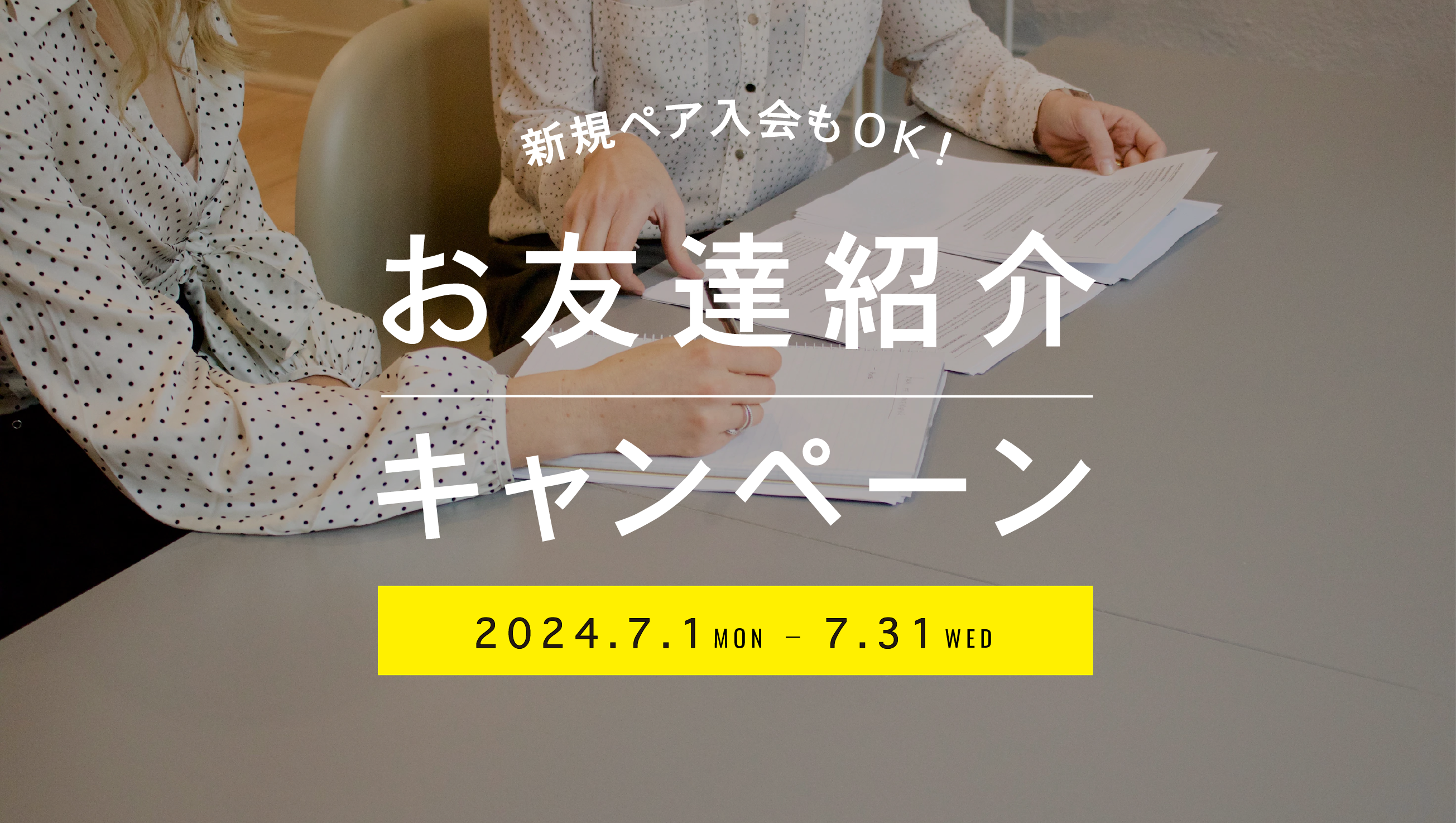 既存の会員さんでお知り合いがいなくとも、周りに一緒に入会を検討されている方がいらっしゃれば、ペア入会として申込いただくと、通常10,000円かかる入会金が0円になります。