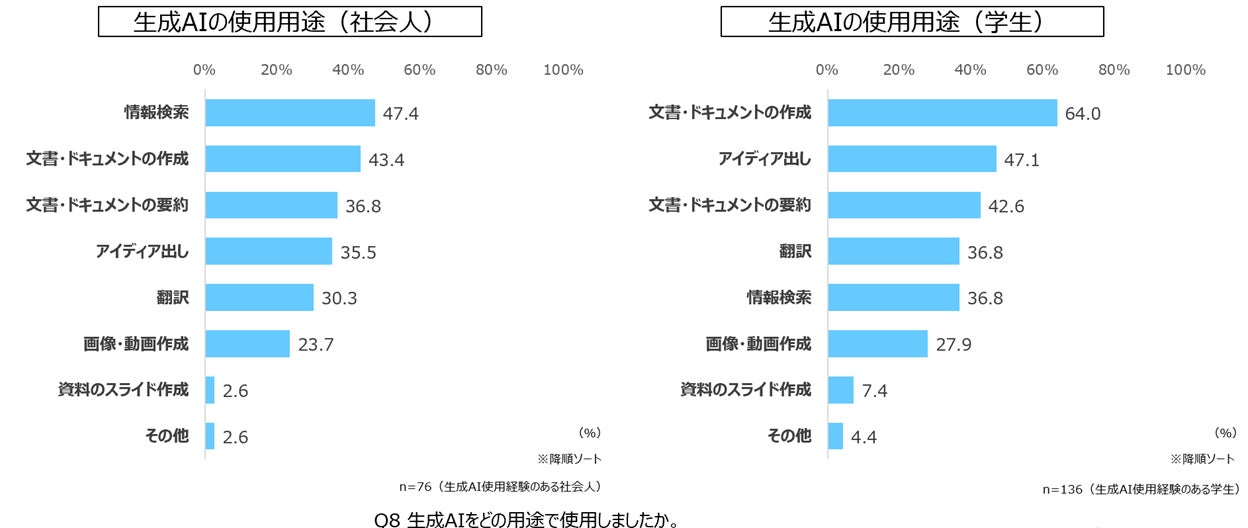 次に、 「アイディア出し」(42.9%)、「文書・ドキュメントの要約」(40.6%)、「情報検索」(40.6%)などの使い方が挙がる。Z世代の学生は、生成AIを「文書・ドキュメント作成」で多く使っている一方で、Z世代の社会人は「情報検索」での使用が最も多い。