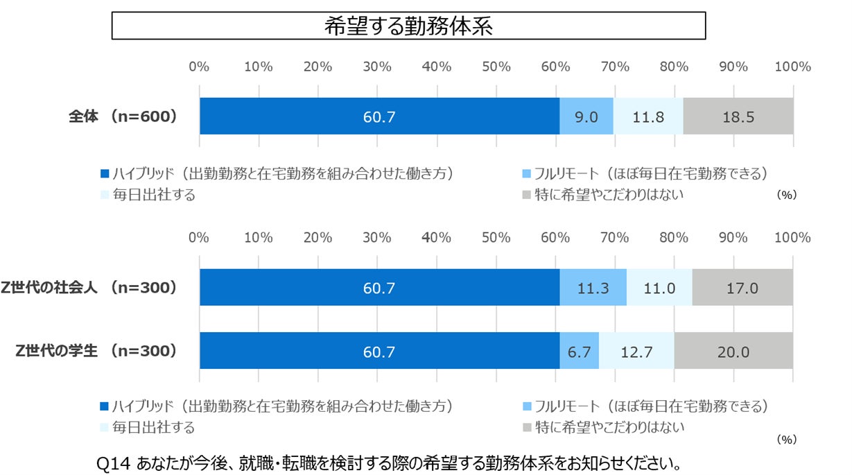 Z世代の大半が勤務体系にこだわりがある。6割が「ハイブリッド」を希望。