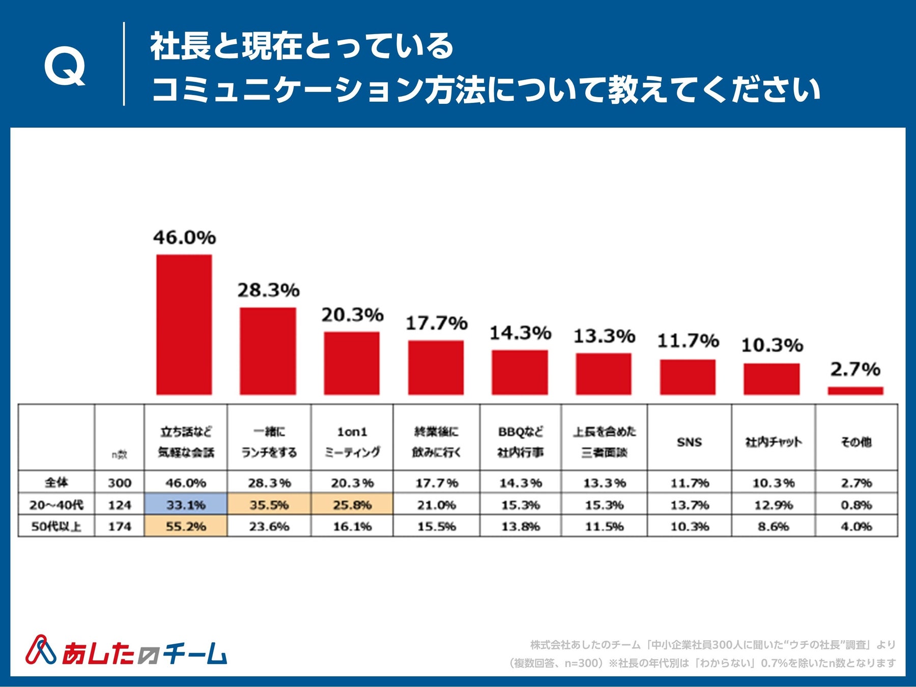 社長とのコミュニケーション方法、「立ち話など気軽な会話」46.0%、「一緒にランチをする」28.3%、