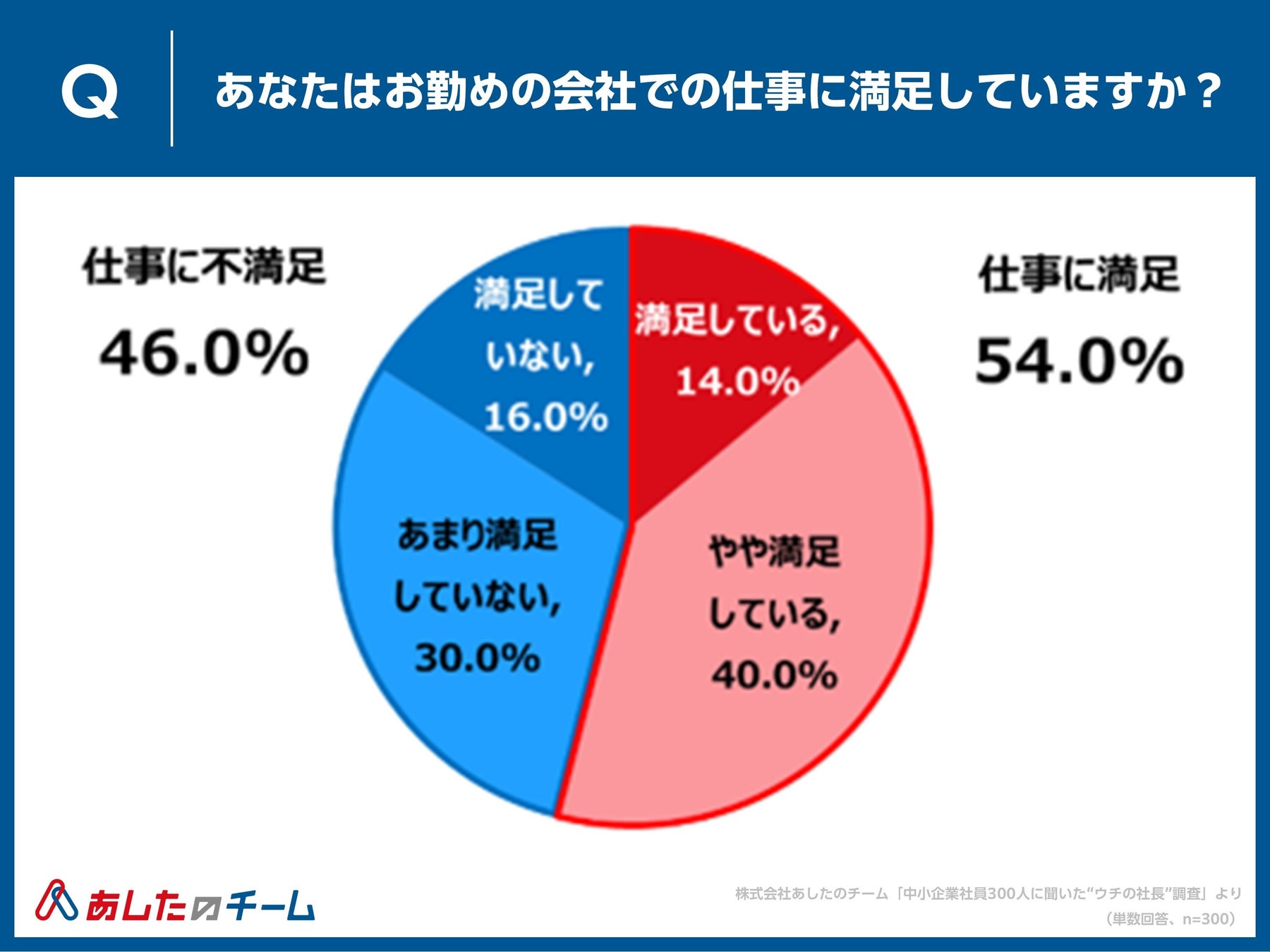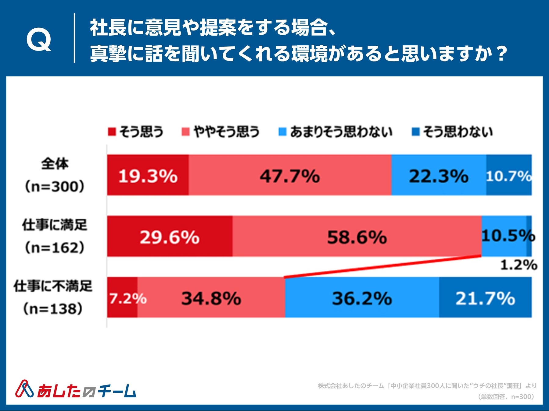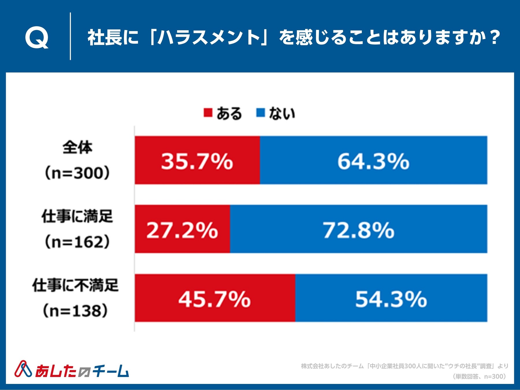 人事評価制度の構築・運用・クラウド化で “人と組織の成長” を支援する株式会社あしたのチーム(本社:東京都中央区、代表取締役社長 CEO:赤羽博行、以下「あしたのチーム」)は、国内中小企業の組織課題や実態の把握を目的に、“社長”にフォーカス。「中小企業社員300人に聞いた“ウチの社長”調査」を実施しました。