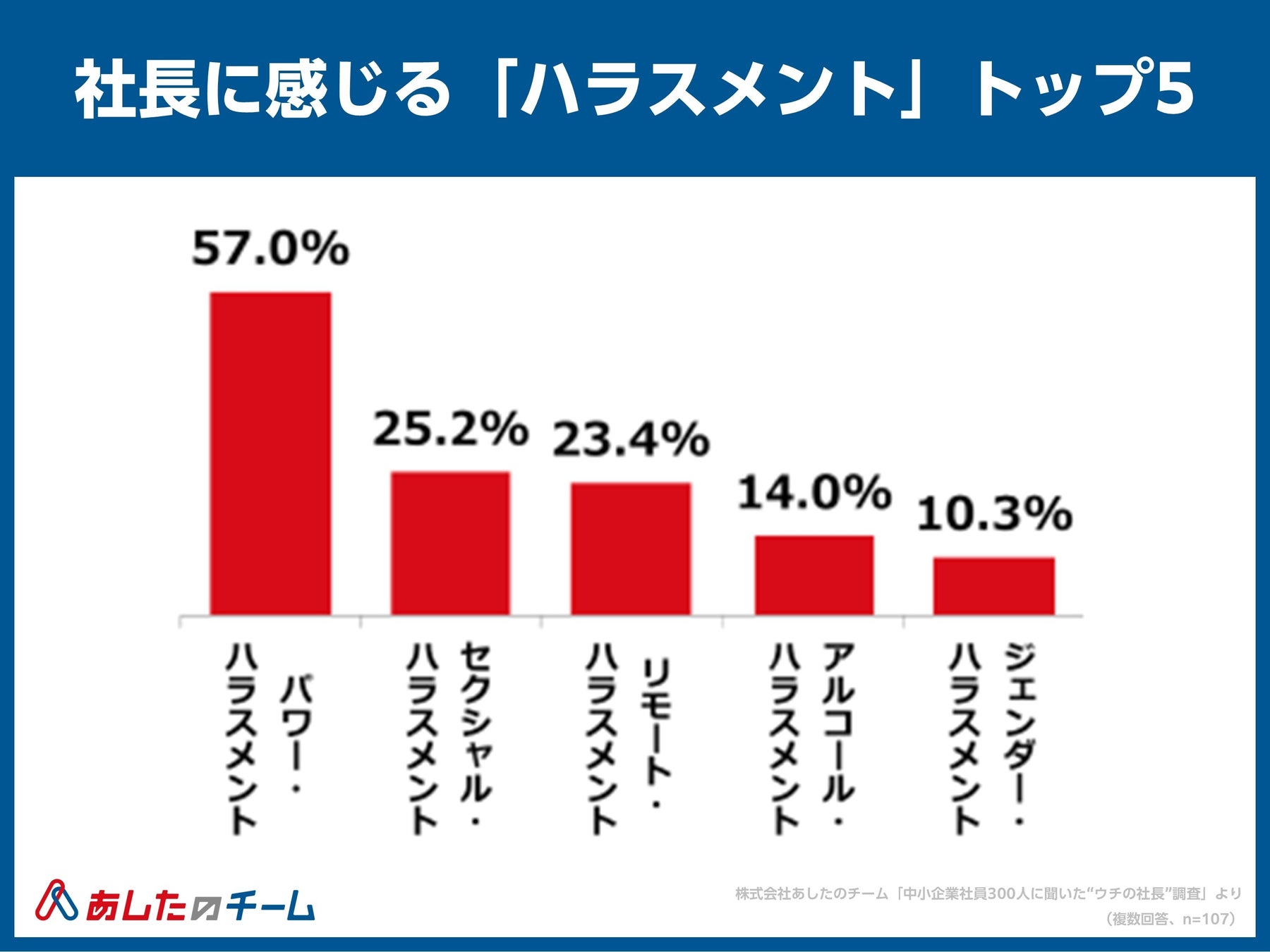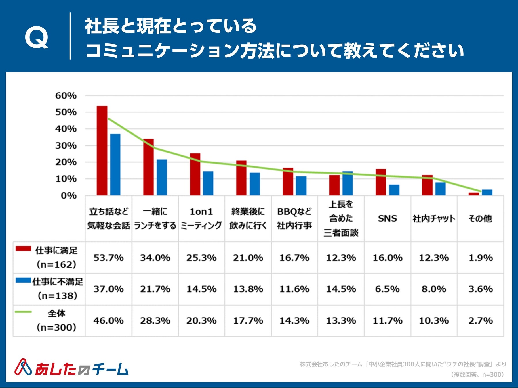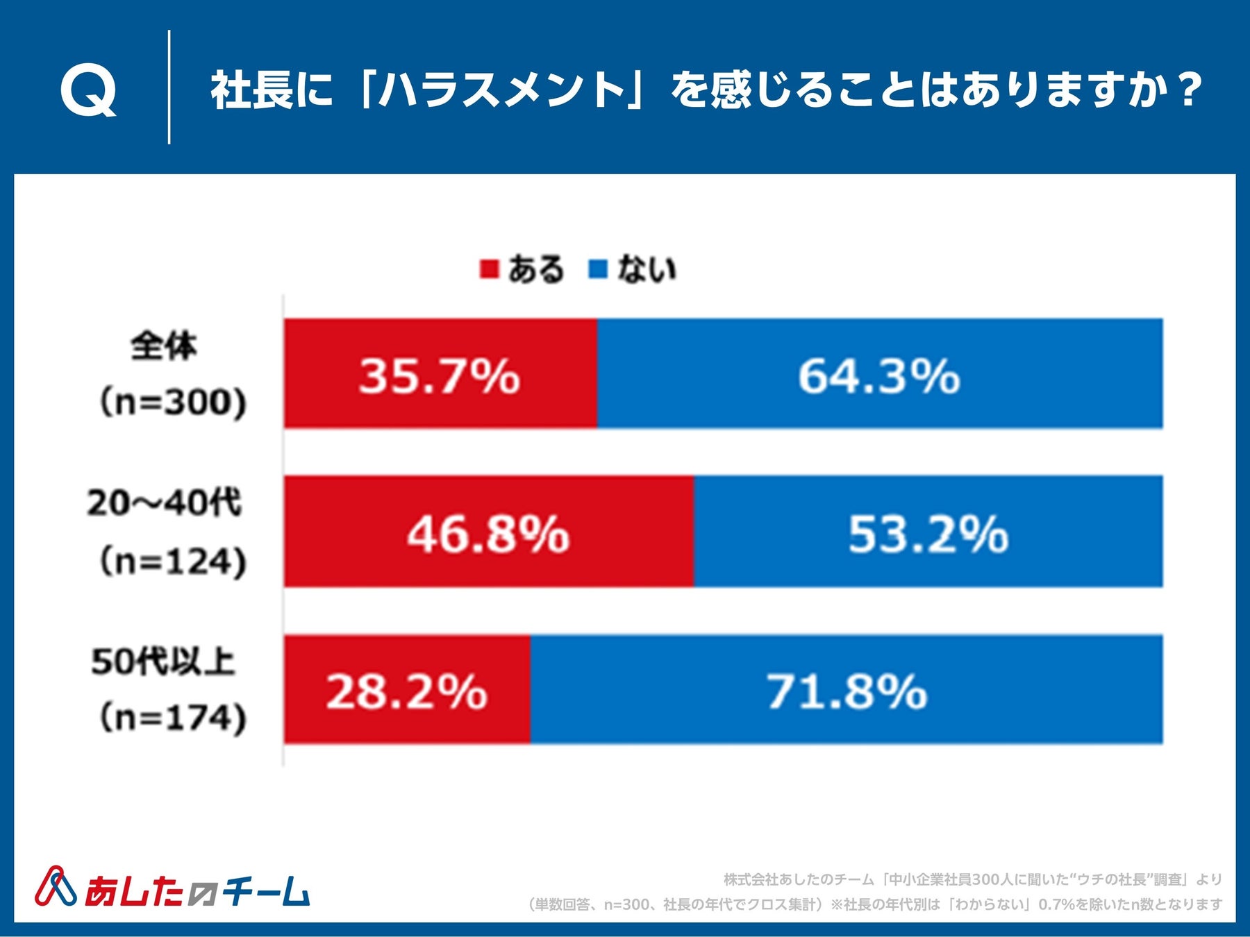 人事評価制度の構築・運用・クラウド化で “人と組織の成長” を支援する株式会社あしたのチーム(本社:東京都中央区、代表取締役社長 CEO:赤羽博行、以下「あしたのチーム」)は、国内中小企業の組織課題や実態の把握を目的に、“社長”にフォーカス。「中小企業社員300人に聞いた“ウチの社長”調査」を実施しました。