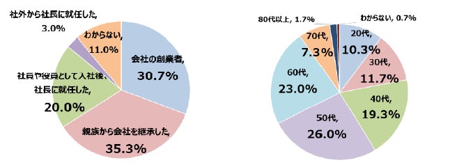 調査回答者である全国の中小企業で働く20代~40代社員の、自社の社長のプロフィールは上グラフの通りです。社長就任の経緯は「親族から会社を継承した」が35.3%で最多、「会社の創業者」30.7%、「社員や役員として入社後、社長に就任した」20.0%。年代は、40代以下の社長が合計41.3%、50代以上が合計58.0%。本調査レポートでは社長の年齢別「20~40代」「50代以上」の比較もしています。