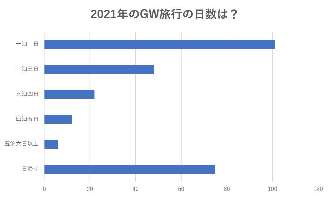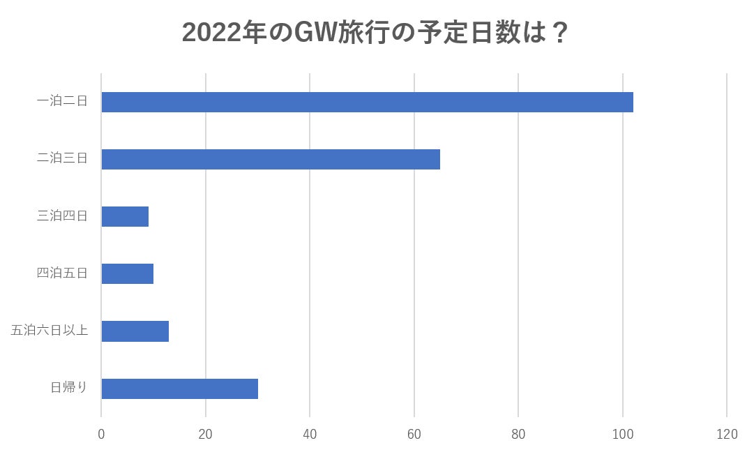 ゴールデンウィークの旅行について、2022年の予定と、2021年に何泊の旅行をしたか聞いたところ、2021年に多かった「日帰り」という意見が2022年は大幅に減り、「二泊三日」が増加しました。また、数値自体は大きくないものの、「五泊六日以上」の旅行を考えている割合が2021年より増加しました。