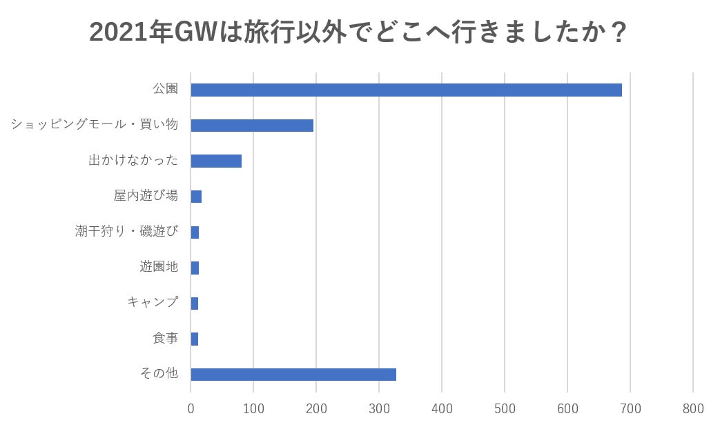 2021年のゴールデンウィークについては、約半数が「旅行の予定は立てず、自宅で過ごした」と回答。また、旅行以外でどんな過ごし方をしたか聞いたところ、「公園」(686pt)という意見が半数を占め、外出を自粛して近場で時間を過ごしていた様子がうかがえます。