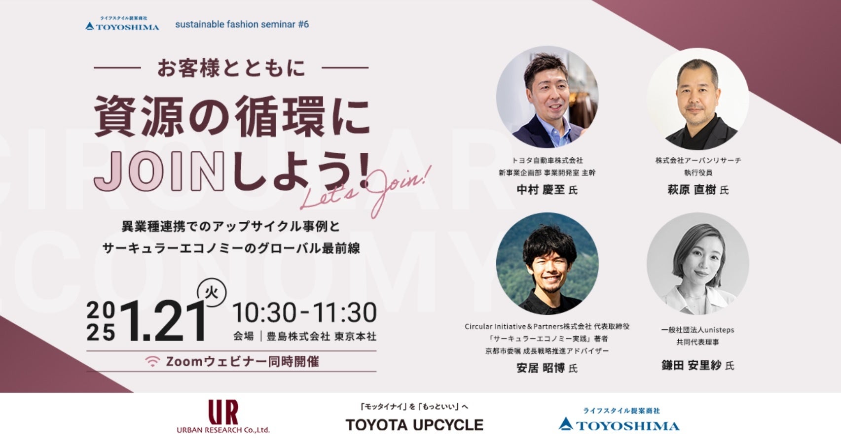 快適なライフスタイルの提案を進める豊島株式会社(本社:名古屋市中区、代表取締役社長:豊島半七)は、この度、トヨタ自動車株式会社 新事業企画部 事業開発室 主幹の中村 慶至氏、株式会社アーバンリサーチ 執行役員の萩原直樹氏、「サーキュラーエコノミー実践(学芸出版社)」著者の安居 昭博氏をお招きし、ファッション業界のサステナビリティ推進と啓発を目的としたサステナブルファッションセミナー「-お客様とともに-資源の循環にJOINしよう!異業種連携でのアップサイクル事例とサーキュラーエコノミーのグローバル最前線」を2025年1月21日(火)に開催いたします。当日はZoomウェビナーでの同時配信を予定しており、事前に専用ページからお申込みをされた方はどなたでもご覧いただけます。