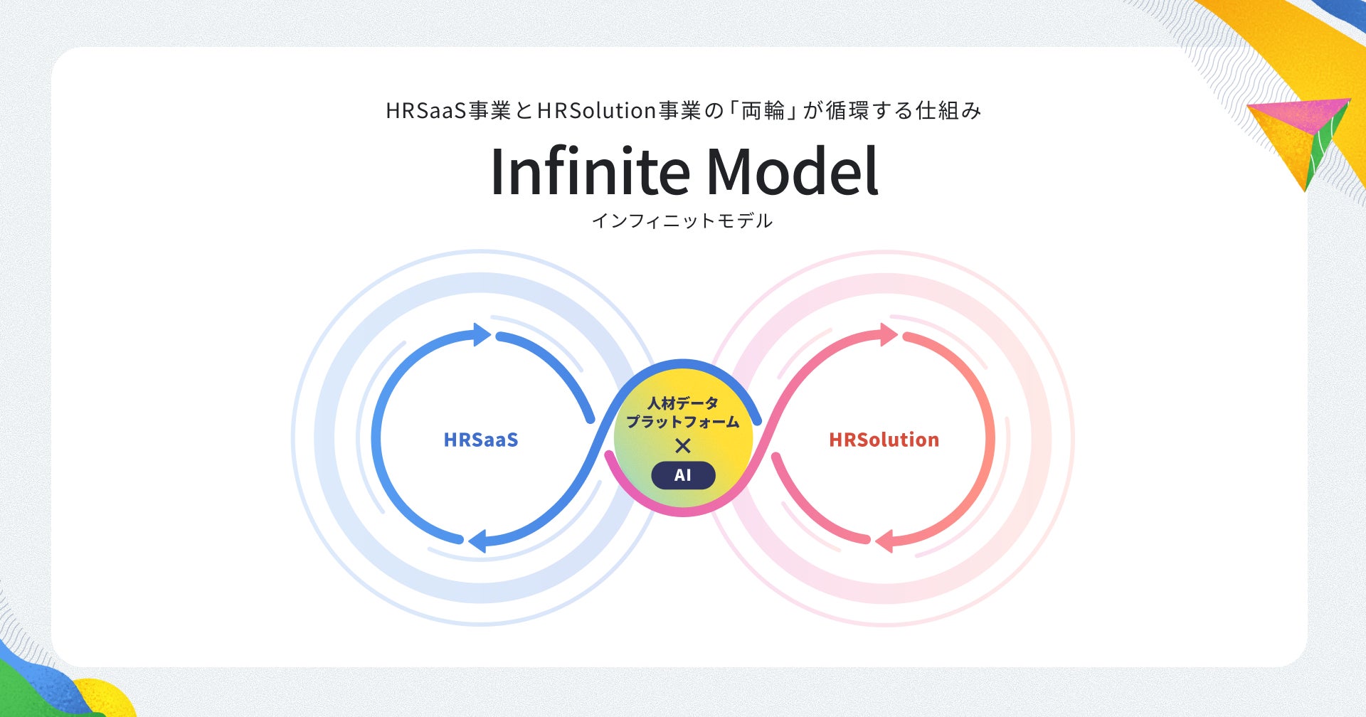 当社は、新ビジョンを実現するために「HRSaaS事業」と「HRSolution事業」の両輪が循環する「Infinite Model」を確立します。