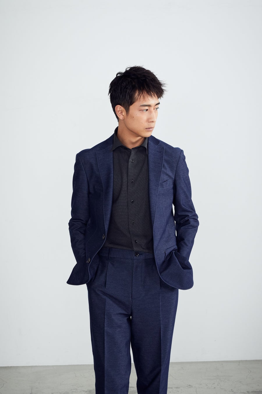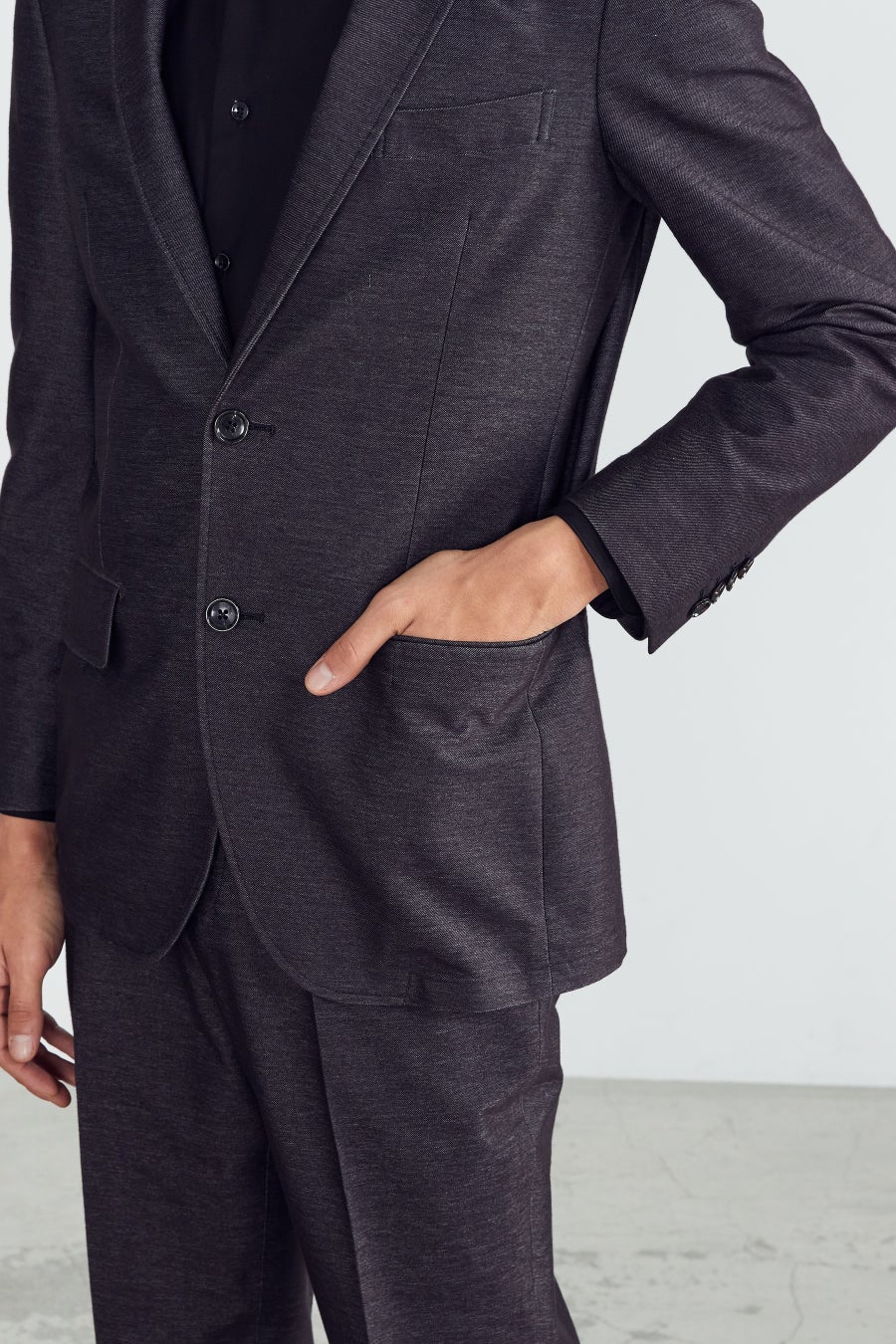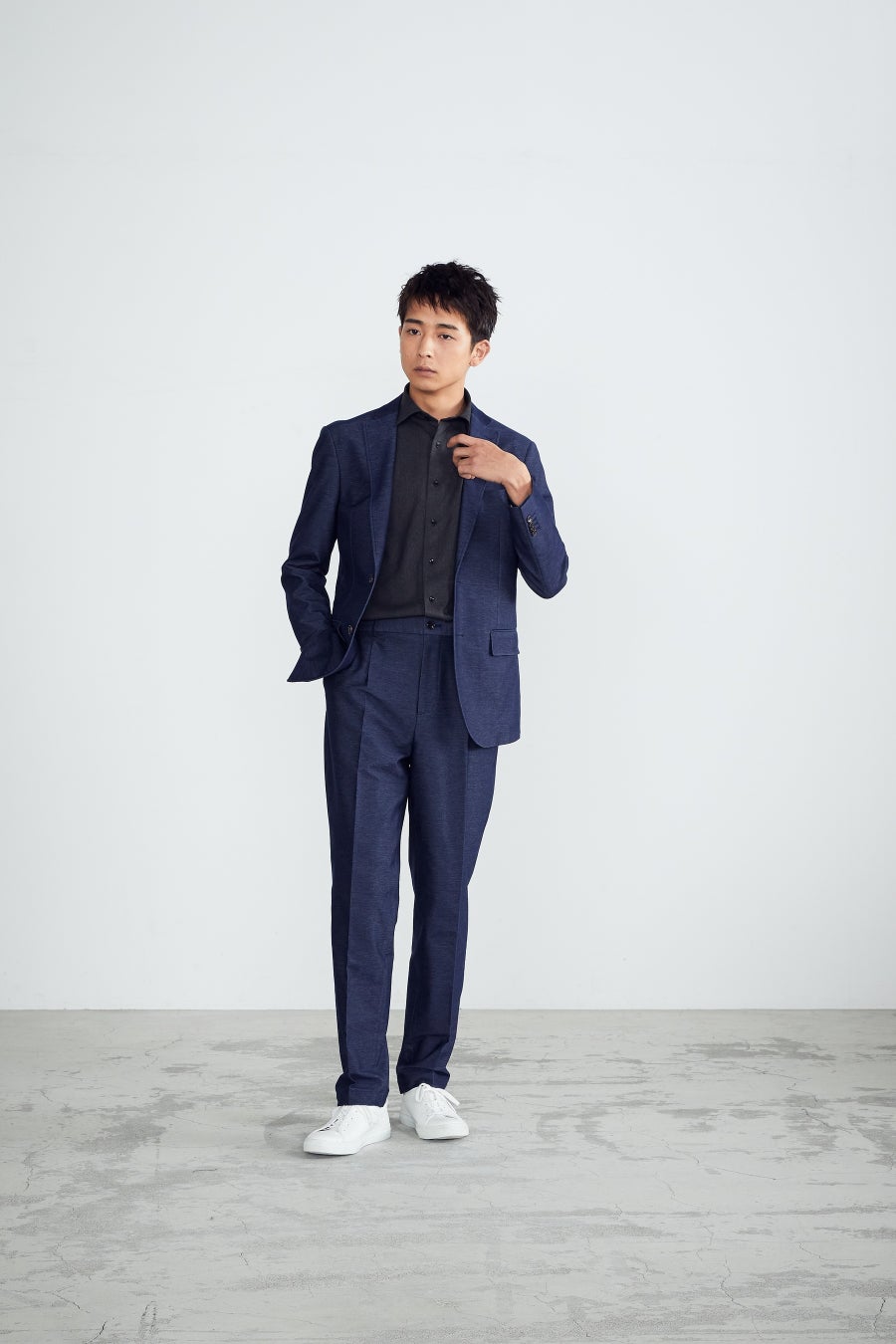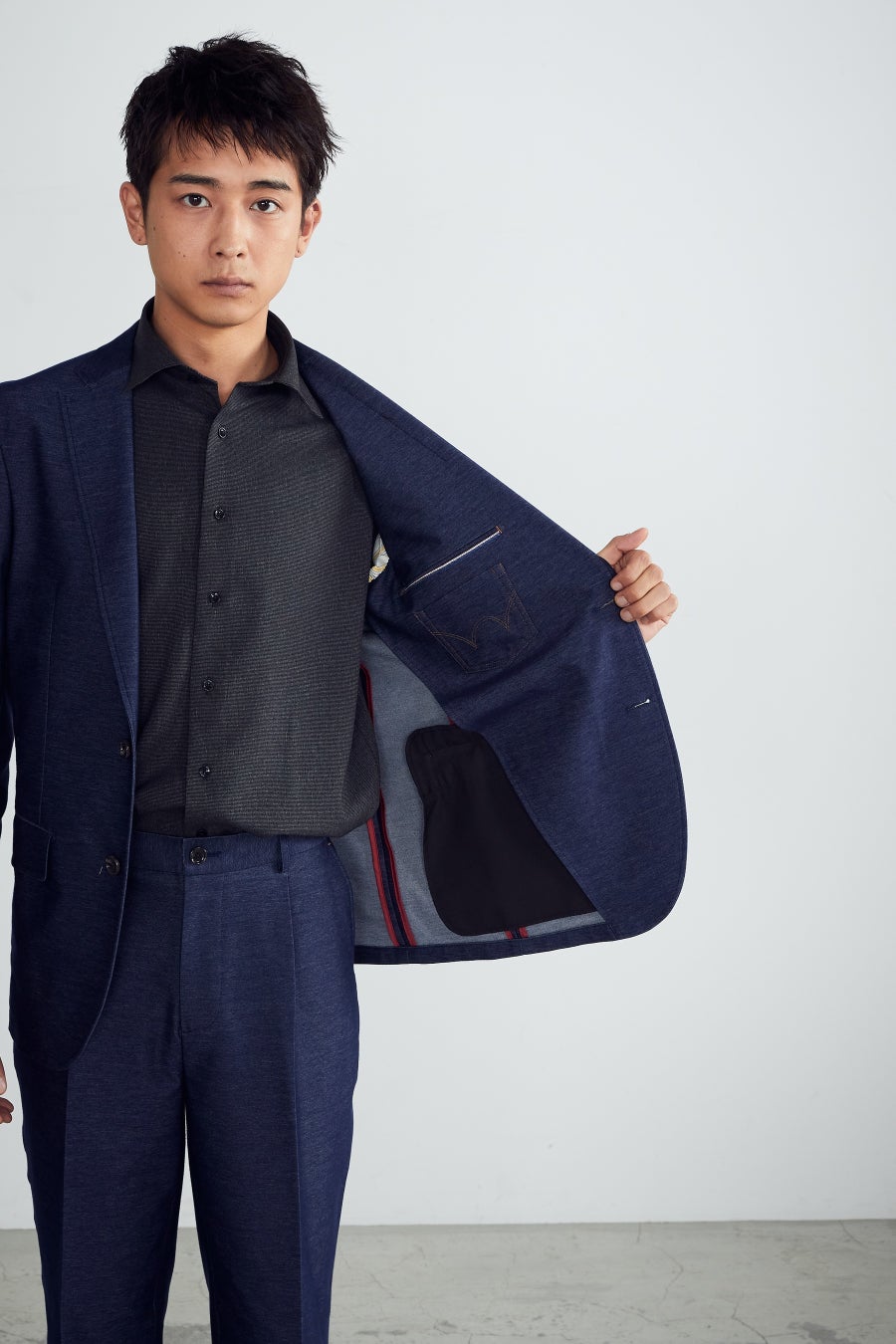 『デニム風ニットセットアップ』は、“デニムに見える”ニット素材“を採用。風合いや裏地の赤色パイピング、金茶色のステッチでデニムのカジュアル感を活かしつつも、すっきりとしたシルエットをキープすることで、ビジネスなどのシーンに馴染む“セットアップ”スタイルを意識しました。ストレスフリーでリラックスした着心地を実現し、通勤時だけでなく在宅ワークなどでも活躍します。