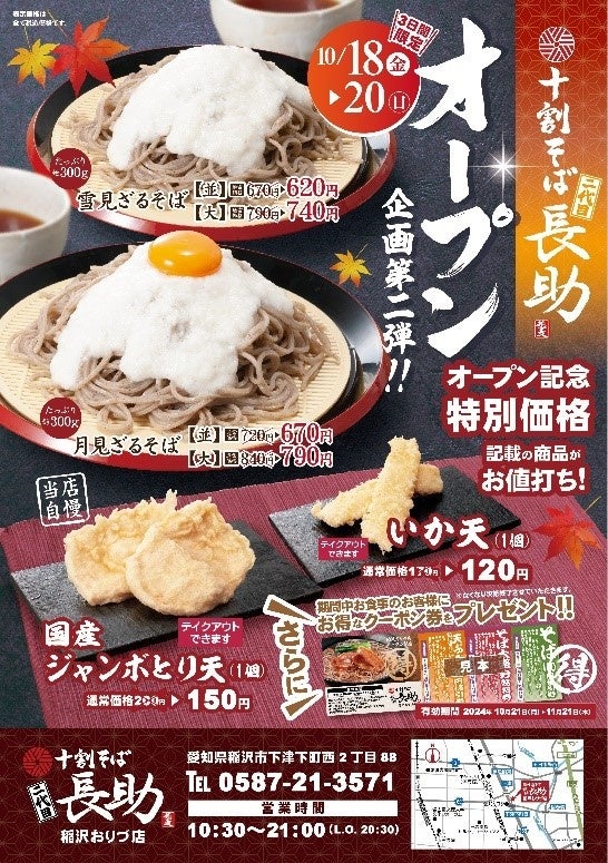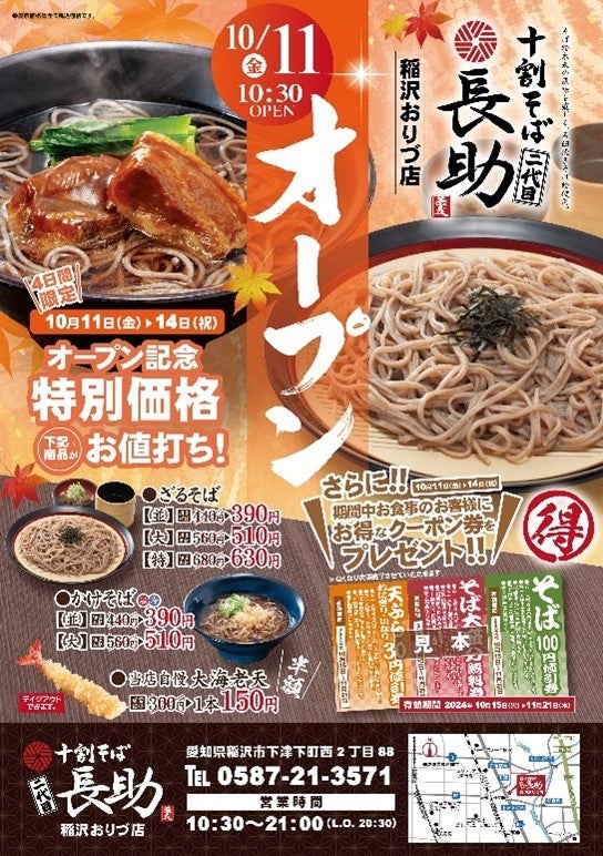 「十割そば 二代目長助 稲沢おりづ店」2024年10月11日(金)グランドオープン!