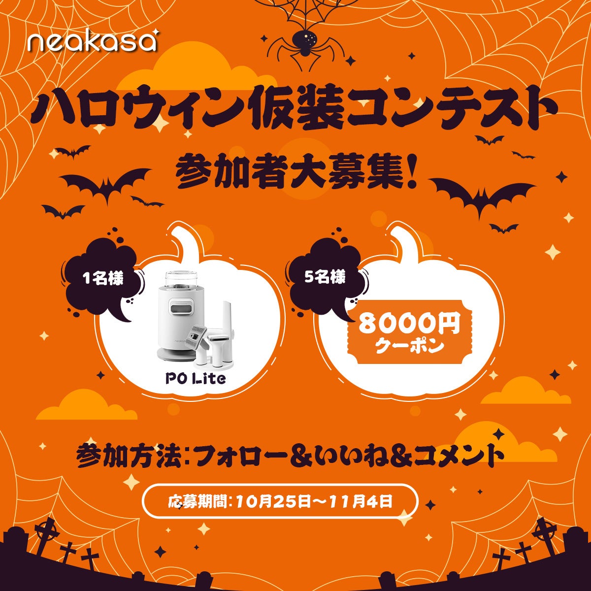 今年のハロウィーンは、Neakasa(ネアカサ)の製品で愛猫やご家をピカピカにしませんか?10月25日から11月4日まで、Neakasaのハロウィーンセールを開催!全製品が最大43%OFFに加え、超人気のM1全自動猫トイレは最大7000円分のクーポンをプレゼント。さらに、ポイントも通常の2倍貯まるお得なチャンスです。