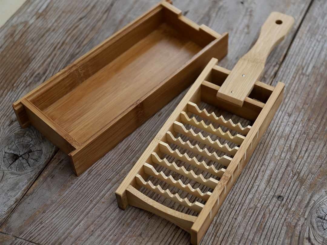 無塗装で竹本来の風合いが魅力の「無塗装炭化竹しゃもじ」、シャキシャキ食感の大根おろしが楽しめる竹製大根おろし「鬼おろし」も展示販売。さらに、白竹の美しさが際立つ「ピクニックバスケット」や「シダ編みかご」など、自然素材の魅力が詰まった商品を多数ご覧いただけます。