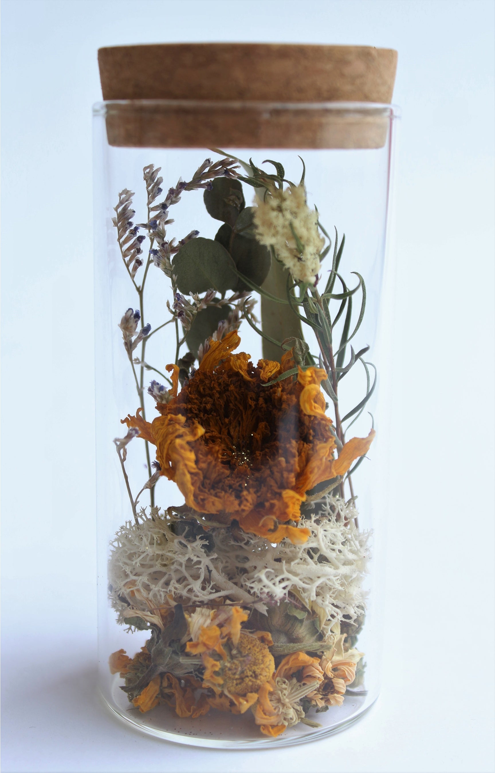 透明なボトルの中に、ドライフラワーを立体的に配置しました。ナチュラルな色合いは、お部屋にすっと馴染み、オシャレな空間を演出してくれます。ご自宅用はもちろんのこと、プレゼントにもおススメの一品です。
