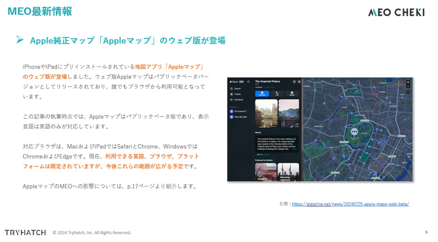 2024年7月の最新情報では、「Yahoo!検索の生成AIが観光のモデルコースを提案する情報」や「Appleマップのウェブ版の情報」などについて掲載。