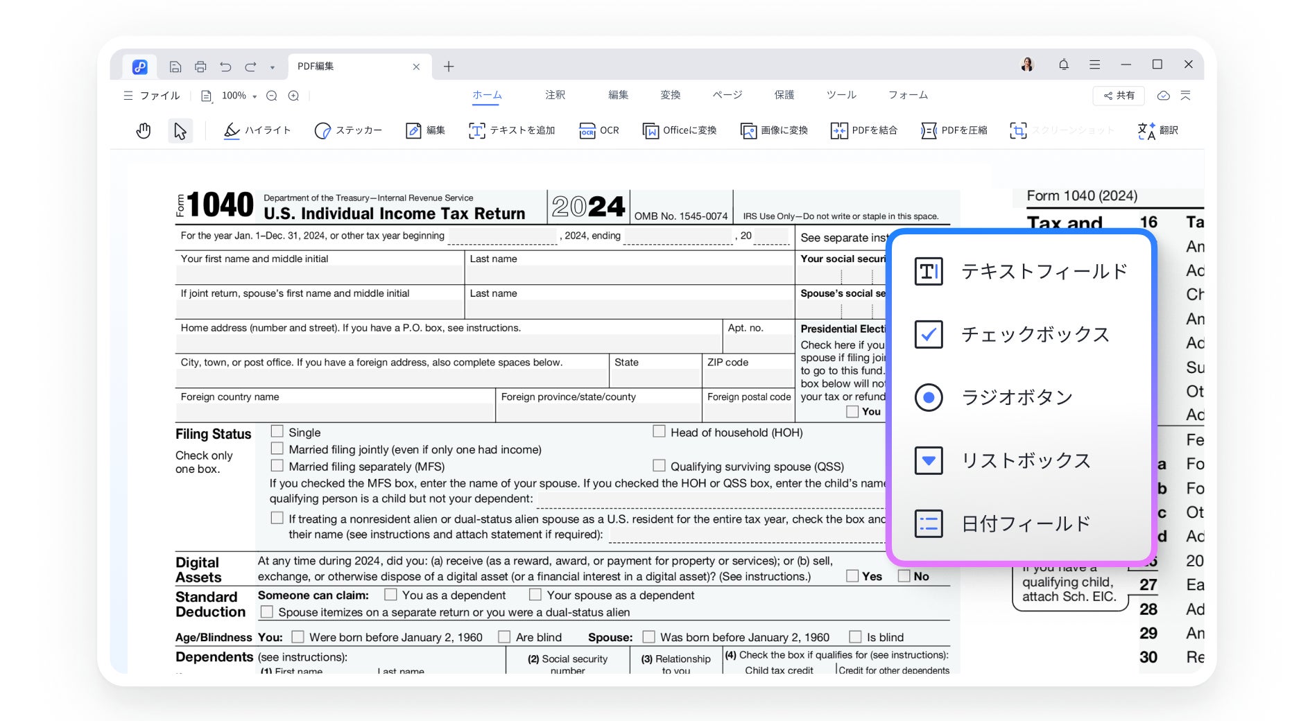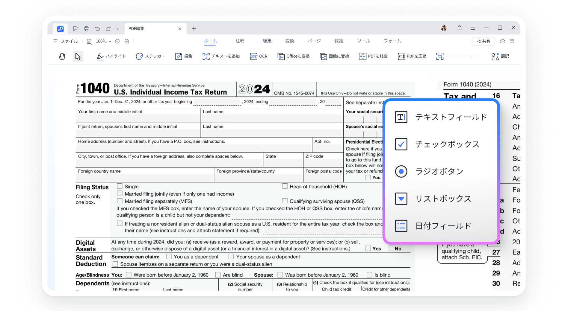これまで閲覧のみ可能だったPDFフォームに対し、フォームフィールドの新規作成・編集がシームレスに行えるようになりました。テキストボックス、チェックボックス、ドロップダウンなどを自由に追加でき、契約書や申込書の作成作業が格段にスムーズになります。