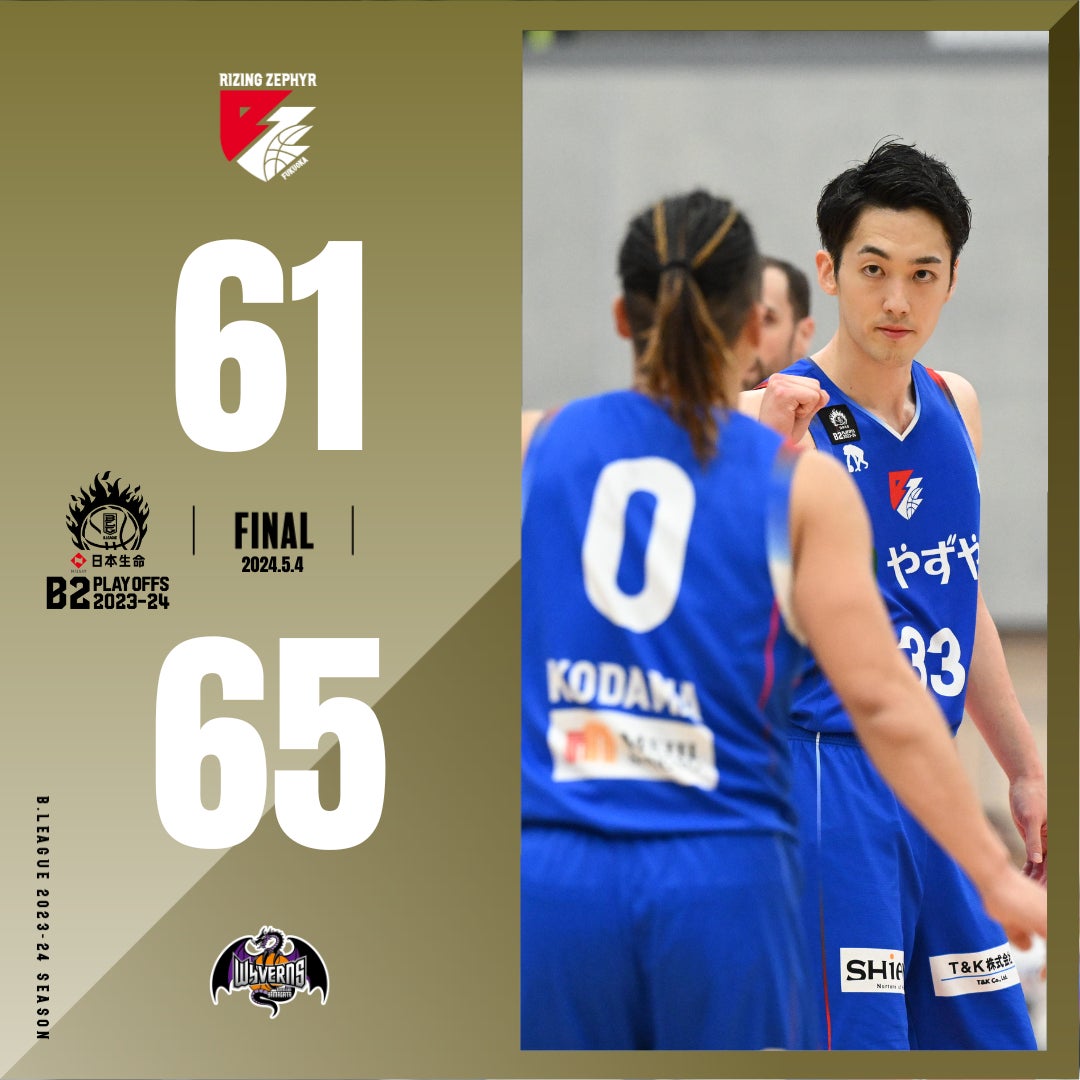 2024年5月4日(土)に開催されました、日本生命 B2 PLAYOFFS 2023-24【ライジングゼファーフクオカvs.山形ワイヴァンズ】において“福岡61-65山形”の結果となりましたことお知らせいたします。