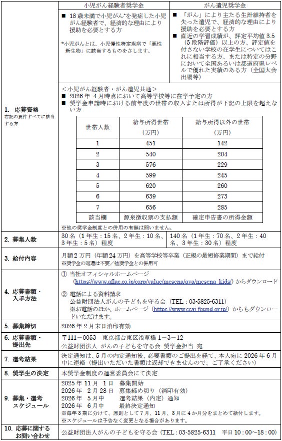 アフラック生命保険株式会社(代表取締役社長:古出 眞敏)は、「アフラック小児がん経験者・がん遺児奨学金制度」における2026年度の新規奨学生を、2025年11月1日から2026年2月28日まで募集します。