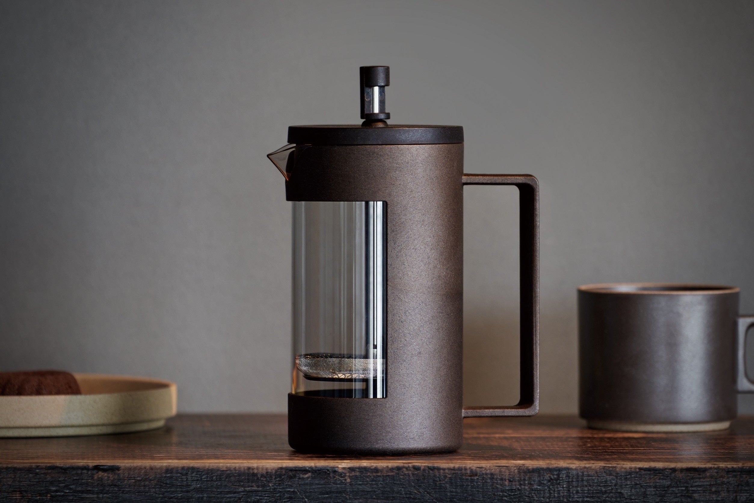 蓋と外側にコーヒーかす素材を使用したコーヒーフレンチプレス。ドリップの技術は不要で、コーヒーの粉とお湯を入れるだけで、簡単に美味しいコーヒーが淹れられます。フィルターは分解が可能なのでお手入れも簡単です。