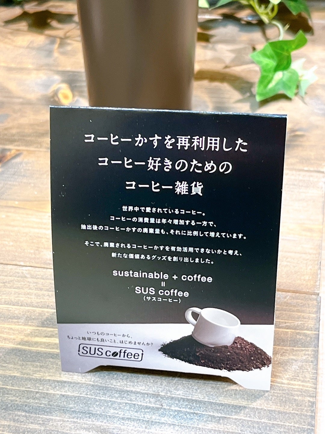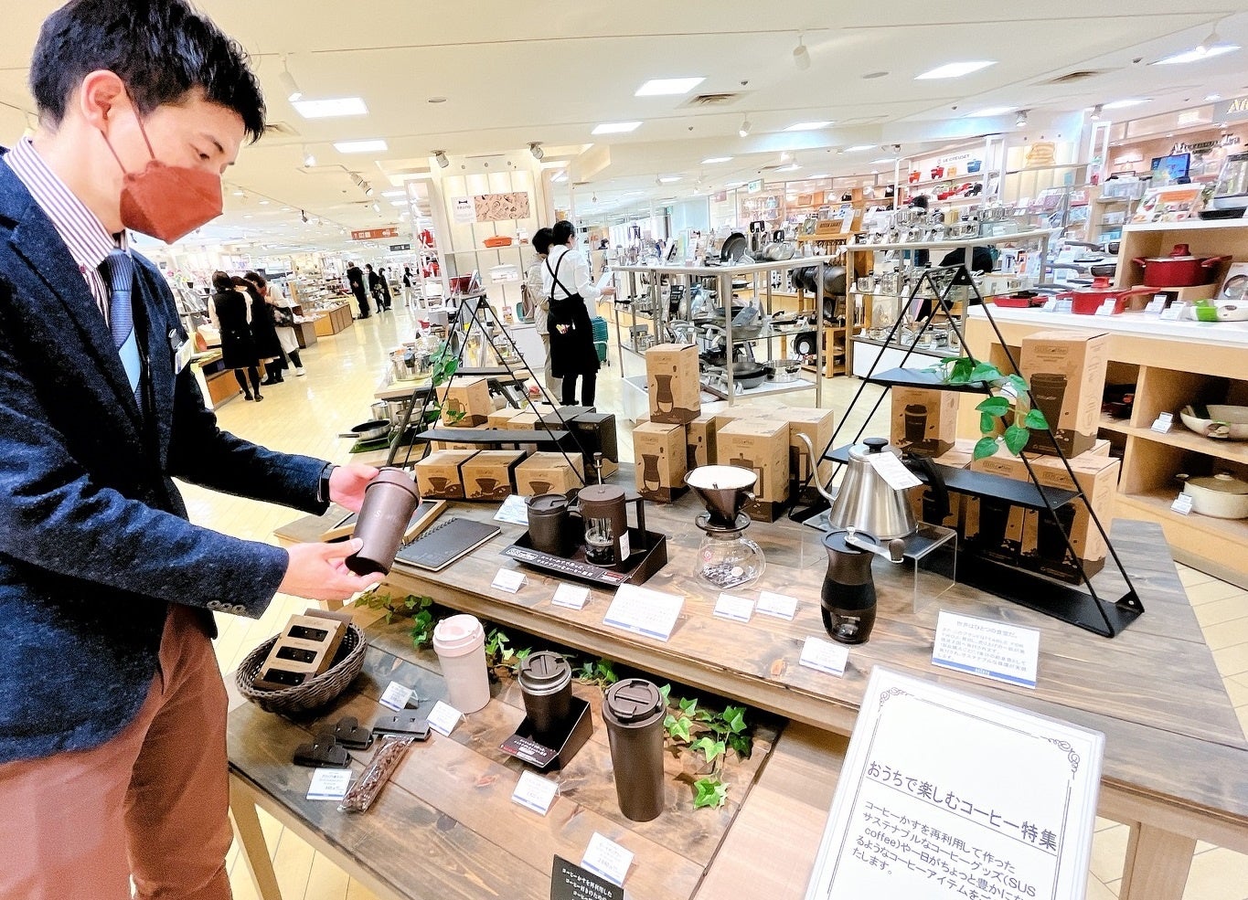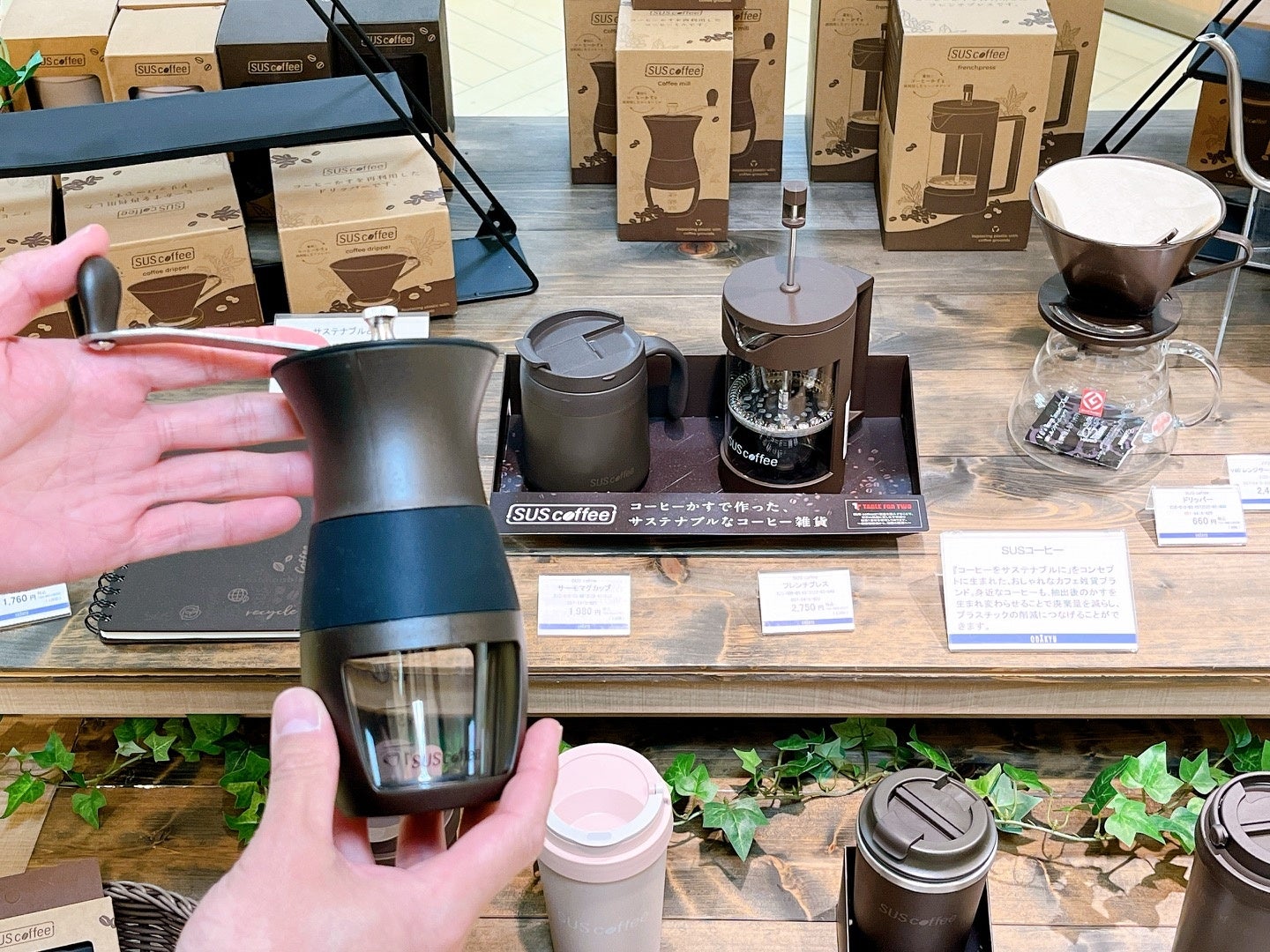 そこで、キッチン用品売場イベントコーナーでは、4月12日(火)まで、廃棄されるはずだったコーヒーかすを再利用して作った『SUS coffee(サスコーヒー)』のコーヒー雑貨を紹介する「おうちで楽しむコーヒー特集」を開催。コーヒーミルやフレンチプレス、ドリッパー、タンブラーなど、じっくりとコーヒーを楽しみたい方におすすめのアイテムを展開しています。