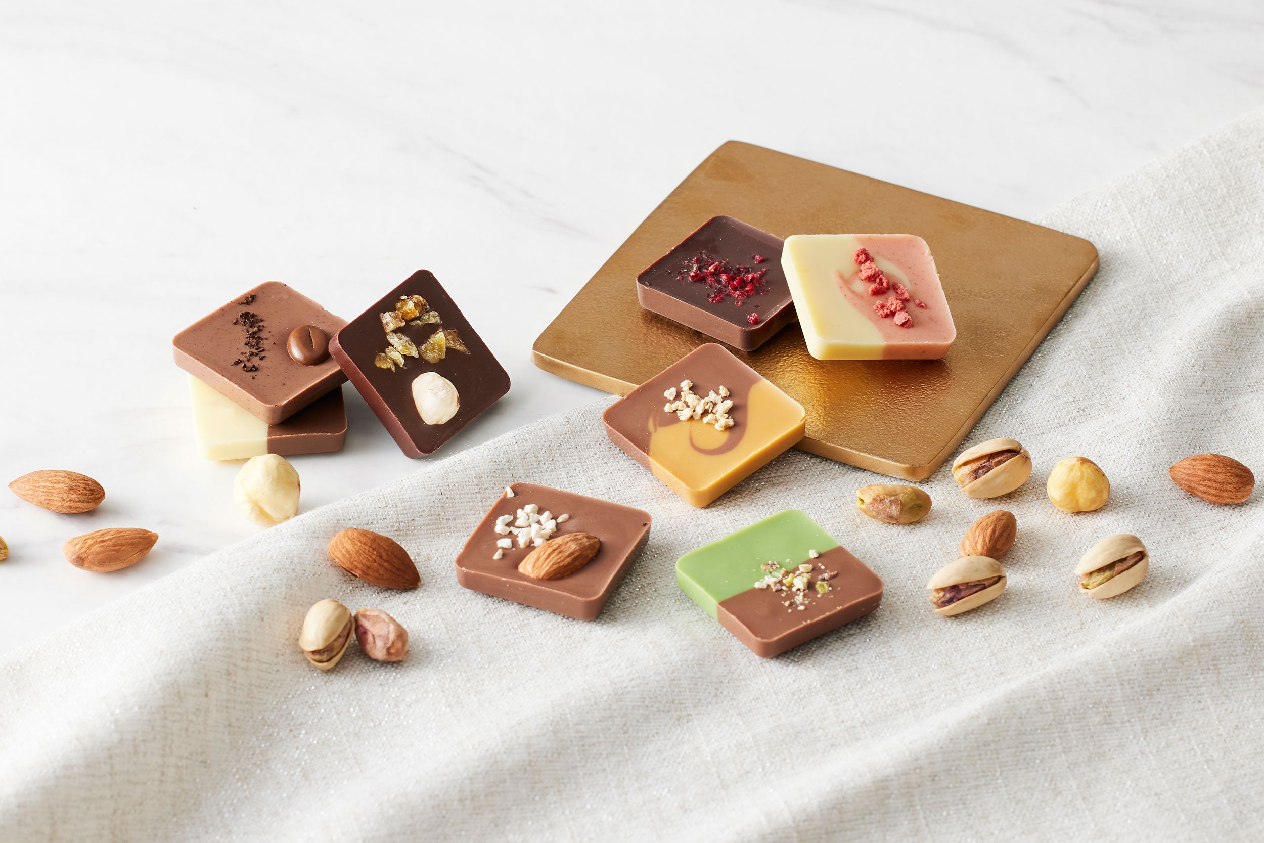 新作のミルクキャラメルをはじめ、ホールアーモンドやオレンジピール、紅茶葉など食感や色合い、香りを楽しめるミニサイズの板チョコレートです。
