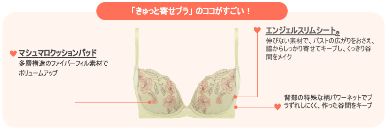 カップ脇の伸びないエンジェルスリムシート®で、脇からバストをしっかり引き寄せてキープし、マシュマロクッションパッドでボリュームアップ! くっきり美しい谷間をメイクします。